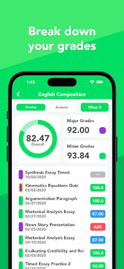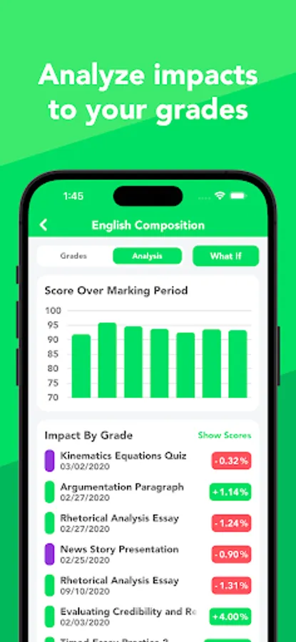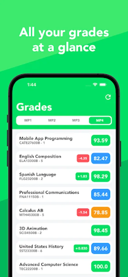 View your class averages over time to see trends and improvements. You can also see how your average has changed since the last time you opened the app, and see which grades have been recently added.
