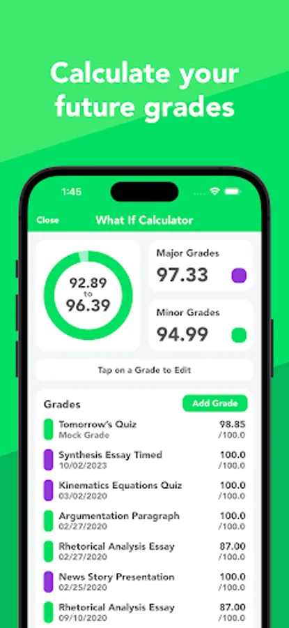 Predict your average by adding mock grades and changing scores to see how it affects your average. This will help you better set goals for the scores you need in the future.