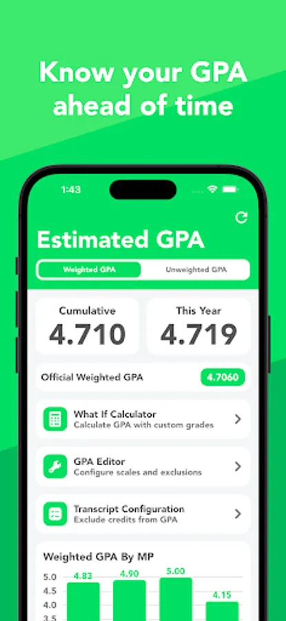 You no longer have to wait for the end of the semester to know your GPA. GradeWay calculates your weighted and unweighted GPA using all of your averages, your transcript, and all your credits. View GPA breakdowns, edit scales, and exclude courses to improve accuracy. Use the built-in what if calculator to predict changes to your GPA.