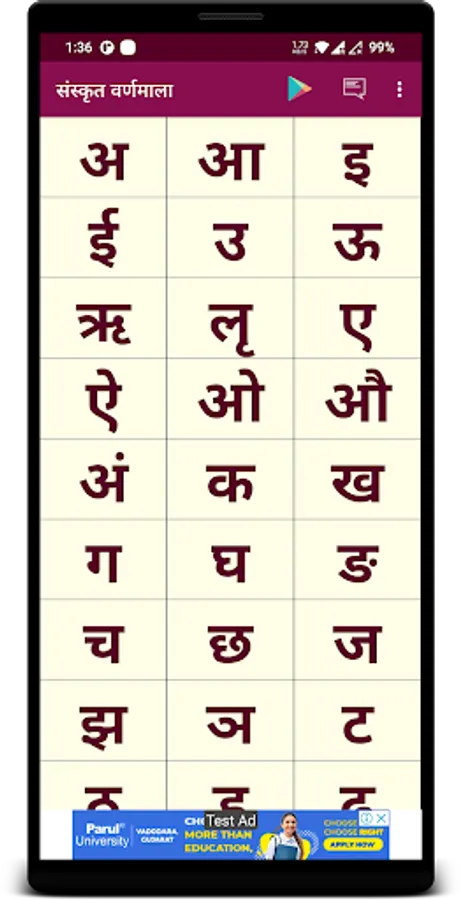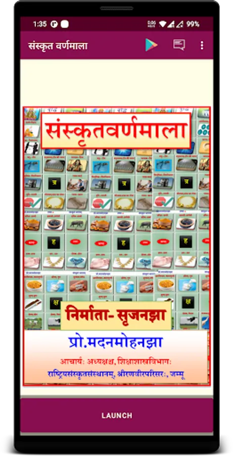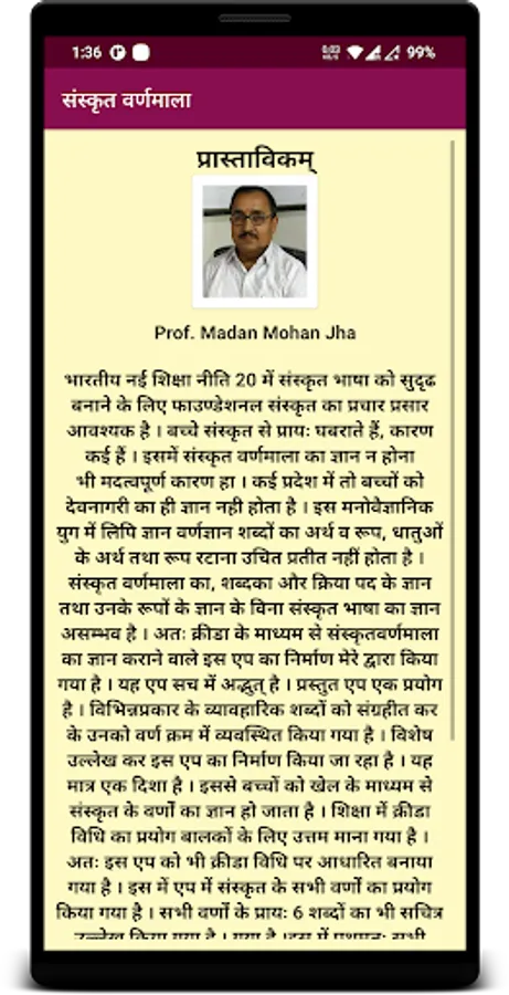 भारतीय नई शिक्षा नीति 20 में संस्कृत भाषा को सुदृढ बनाने के लिए फाउण्डेशनल संस्कृत का प्रचार प्रसार आवश्यक है । बच्चे संस्कृत से प्रायः घबराते हैं, कारण कई हैं । इसमें संस्कृत वर्णमाला का ज्ञान न होना भी मदत्वपूर्ण कारण हा । कई प्रदेश में तो बच्चों को देवनागरी का ही ज्ञान नही होता है । इस मनोवैज्ञानिक युग में लिपि ज्ञान वर्णज्ञान शब्दों का अर्थ व रूप, धातुओं के अर्थ तथा रूप रटाना उचित प्रतीत नहीं होता है ।संस्कृत वर्णमाला का, शब्दका और क्रिया पद के ज्ञान तथा उनके रूपों के ज्ञान के विना संस्कृत भाषा का ज्ञान असम्भव है । अतः क्रीडा के माध्यम से संस्कृतवर्णमाला का ज्ञान कराने वाले इस एप का निर्माण मेरे द्वारा किया गया है । यह एप सच में अद्भुत् है । प्रस्तुत एप एक प्रयोग है । विभिन्नप्रकार के व्यावहारिक शब्दों को संग्रहीत कर के उनको वर्ण क्रम में व्यवस्थित किया गया है । विशेष उल्लेख कर इस एप का निर्माण किया जा रहा है । यह मात्र एक दिशा है । इससे बच्चों को खेल के माध्यम से संस्कृत के वर्णों का ज्ञान हो जाता है । शिक्षा में क्रीडा विधि का प्रयोग बालकों के लिए उत्तम माना गया है । अतः इस एप को भी क्रीडा विधि पर आधारित बनाया गया है । इस में एप में संस्कृत के सभी वर्णों का प्रयोग किया गया है । सभी वर्णों के प्रायः 6 शब्दों का भी सचित्र उल्लेख किया गया है । गया है ।इस में प्रथमतः सभी वर्ण प्रदर्शित होता है । वर्म को स्पर्श करते ही कई चित्र प्रदर्शित होते हैं । चिस भी चित्र का स्पर्श करें उसका संस्कृत शब्द तथा हिन्दी अर्थ उपस्थित हो जाता है साथ ही उसका उच्चारण भी सिखाया जाता है । साथ ही अगले प्रश्न पर जाने का अवसर भी प्रदर्शित हो जाएगा । इस र्य में ध्वनि मुद्रण आवश्यक था । एतदर्थ आचार्या रानी दाधीच जी का सहयोग भी स्मरणीय है । आशा है यह प्रयास संस्कृत सीखने वाले बच्चें के लिए सार्थक सिद्ध होगा । बच्चे मोवाइल में क्रीडा के माध्यम से ही संस्कृत के वर्णमाला को सीख पाएंगें ।