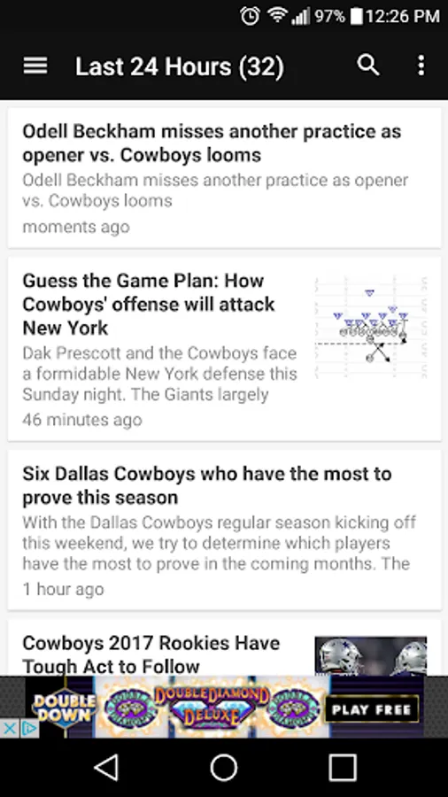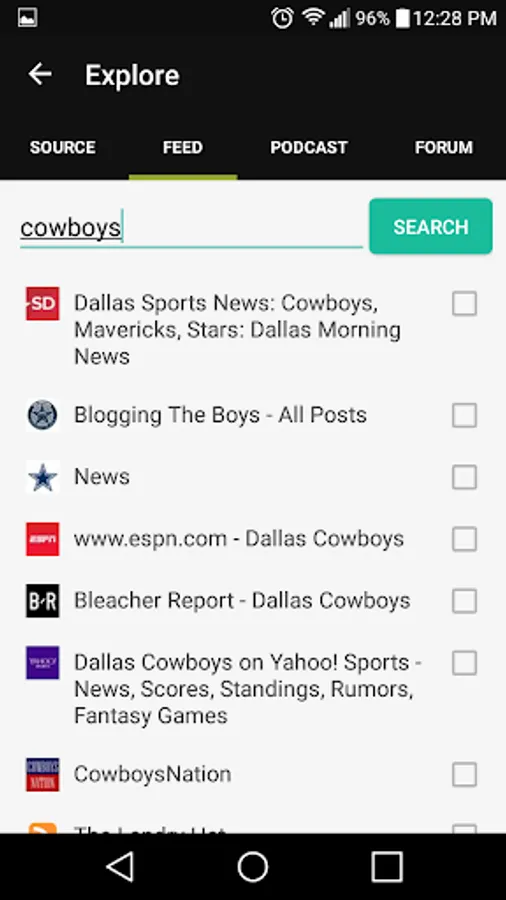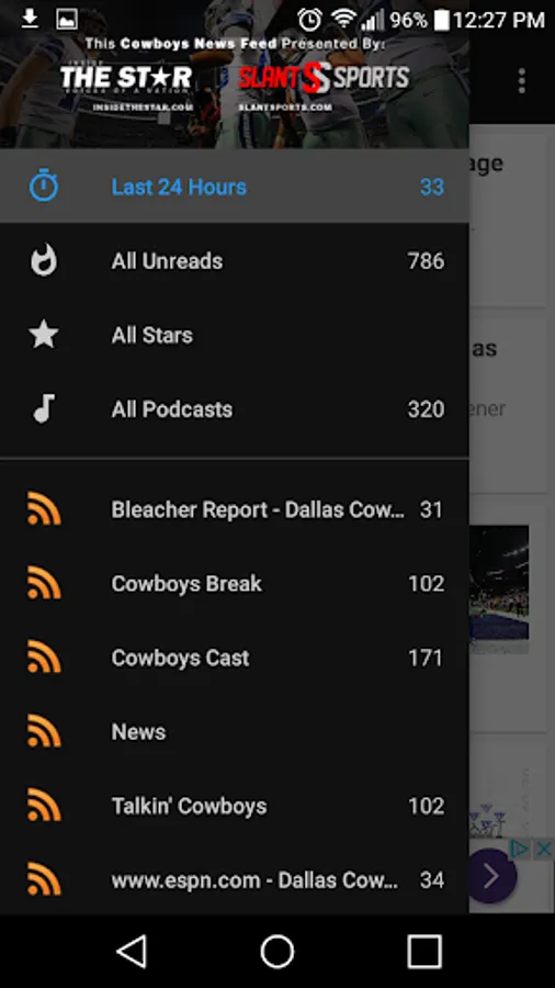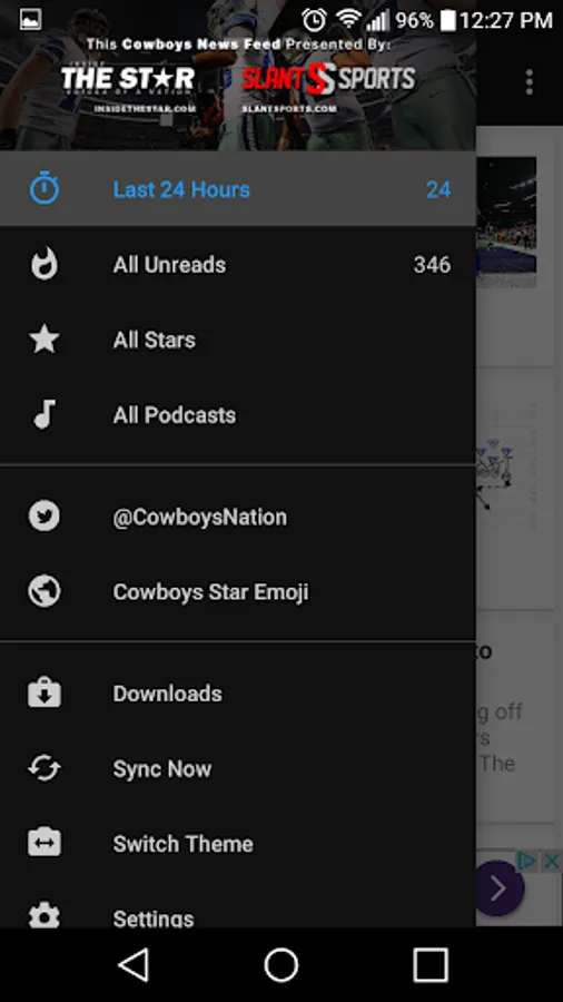 Cowboys news feed app with new update notifications and custom sources available. Default sources include several of the top Dallas football news sites and blogs. Defaults to hourly sync intervals, which can be changed via settings, and includes the latest Twitter feed for team news. Also includes quick access to the star emoji, the Dallas Cowboys official YouTube channel, and a podcast player loaded with the hottest shows.