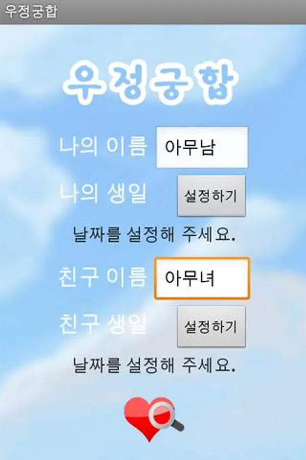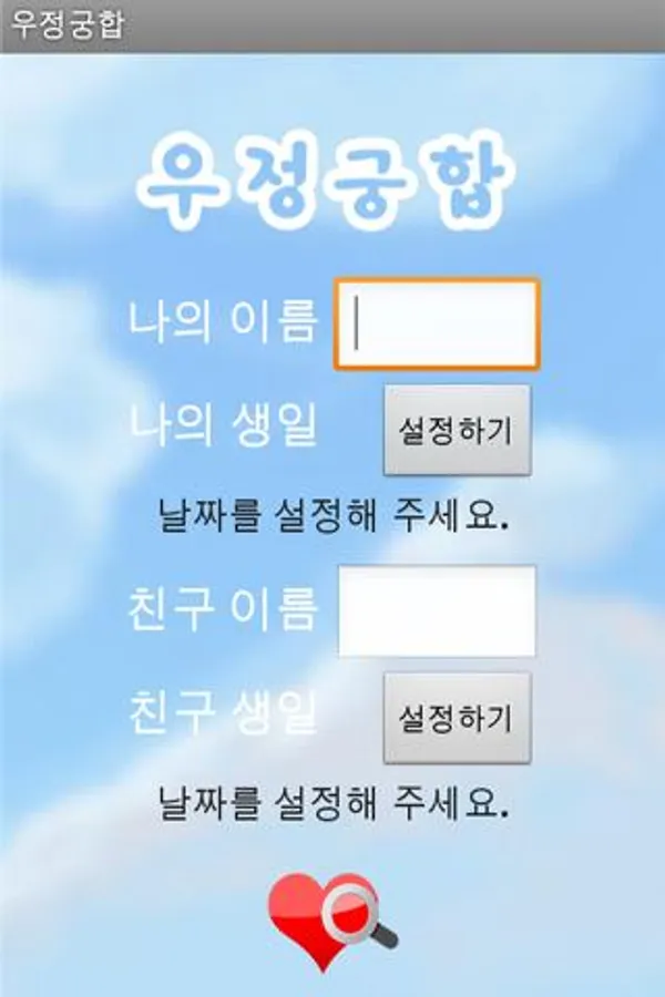 나와 친구 또는 지인의 이름과 생일을 입력해 궁합을 보는 어플!!