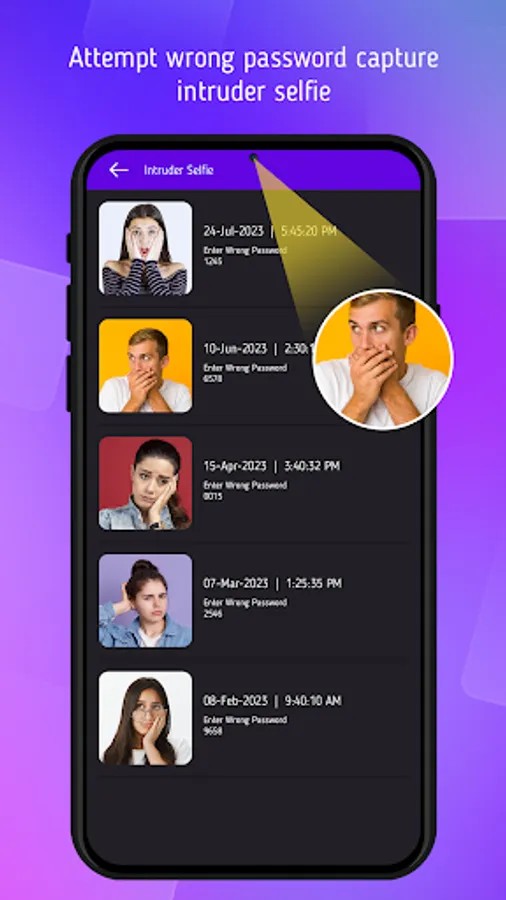 Gallery lock video hider will capture the photo and provide you break in alerts when some one trying to access your private storage by entering wrong PIN. So it's simple to identify person who has tried to access your private data.
