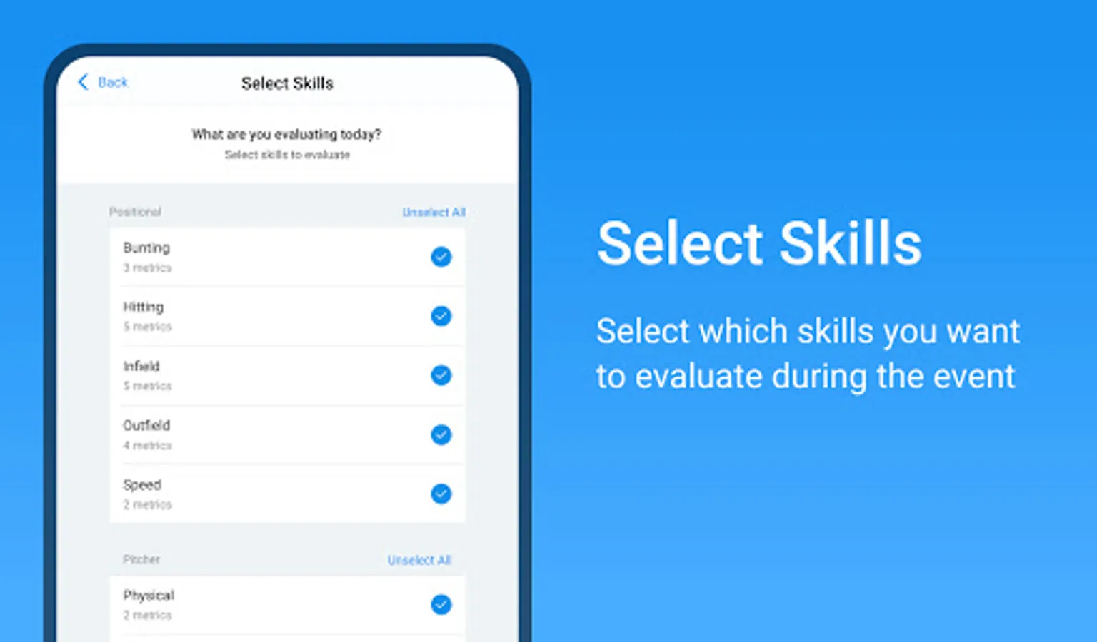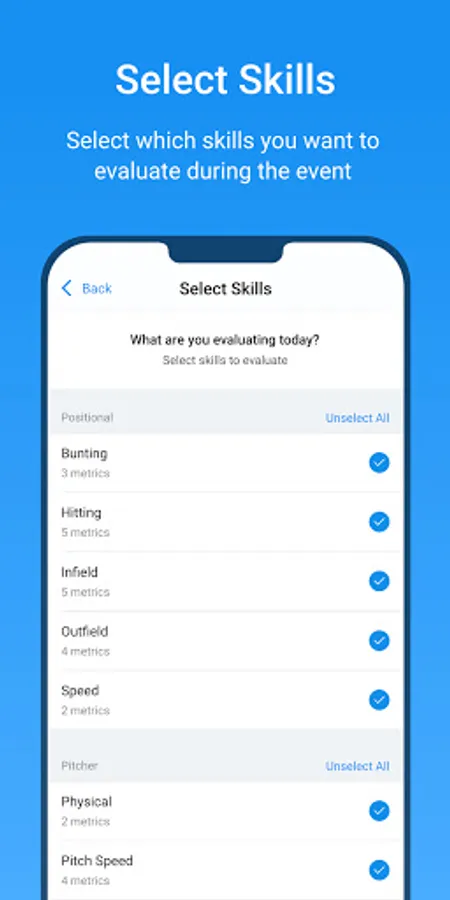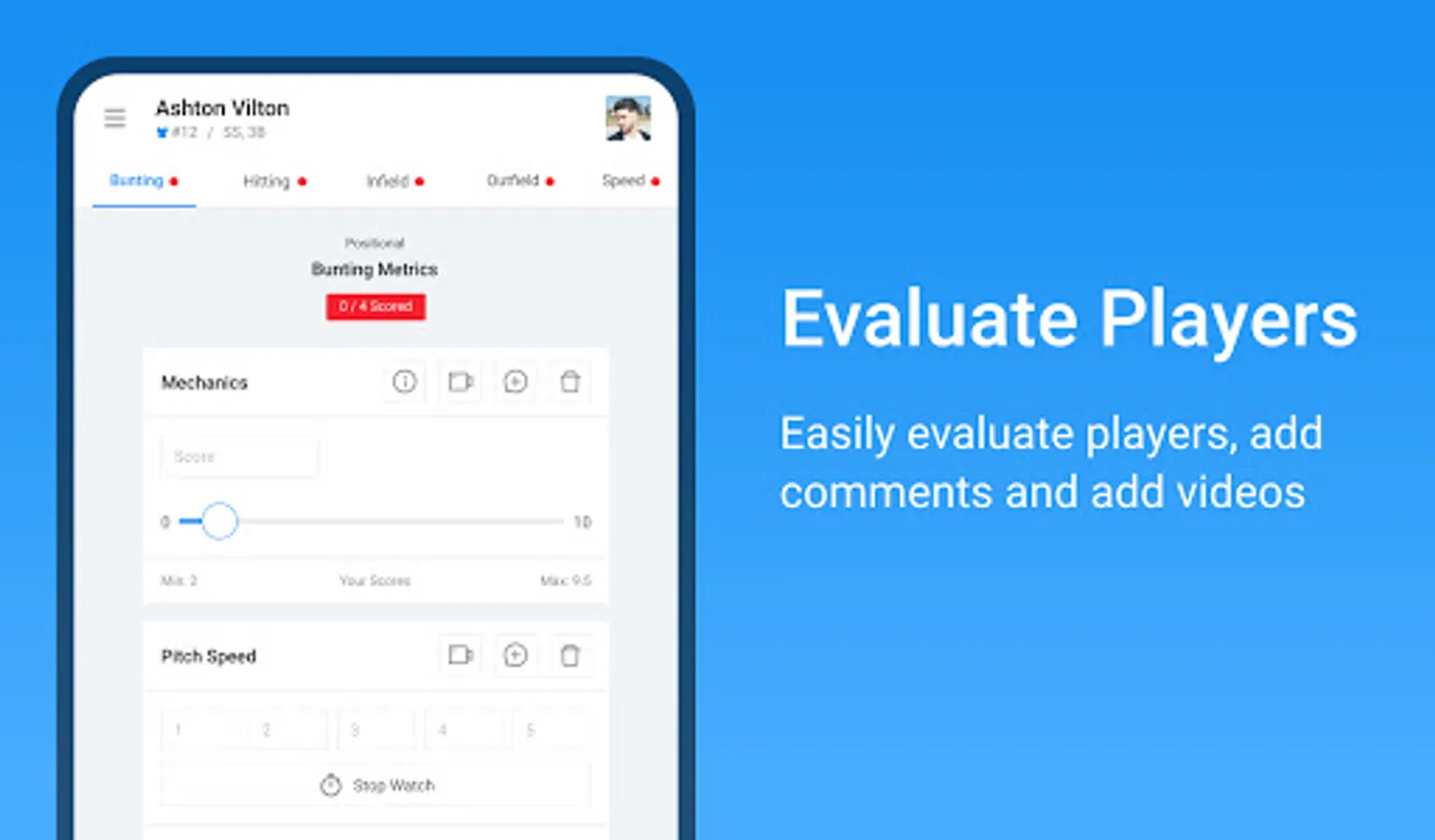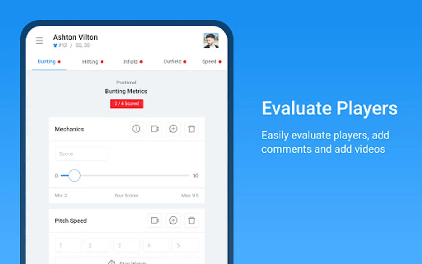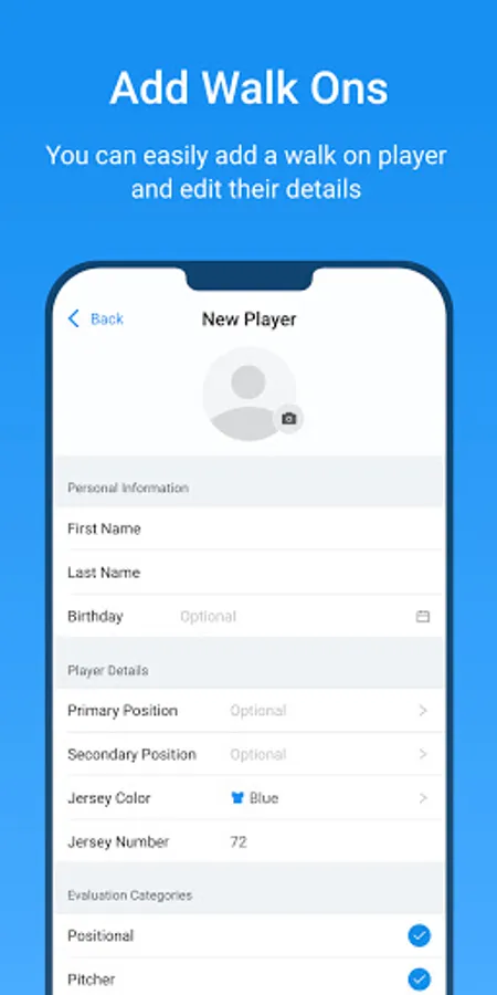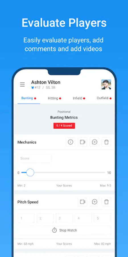Once players have been added, and an event is created, the evaluators can use the app from the Google Play Store to input athlete data.