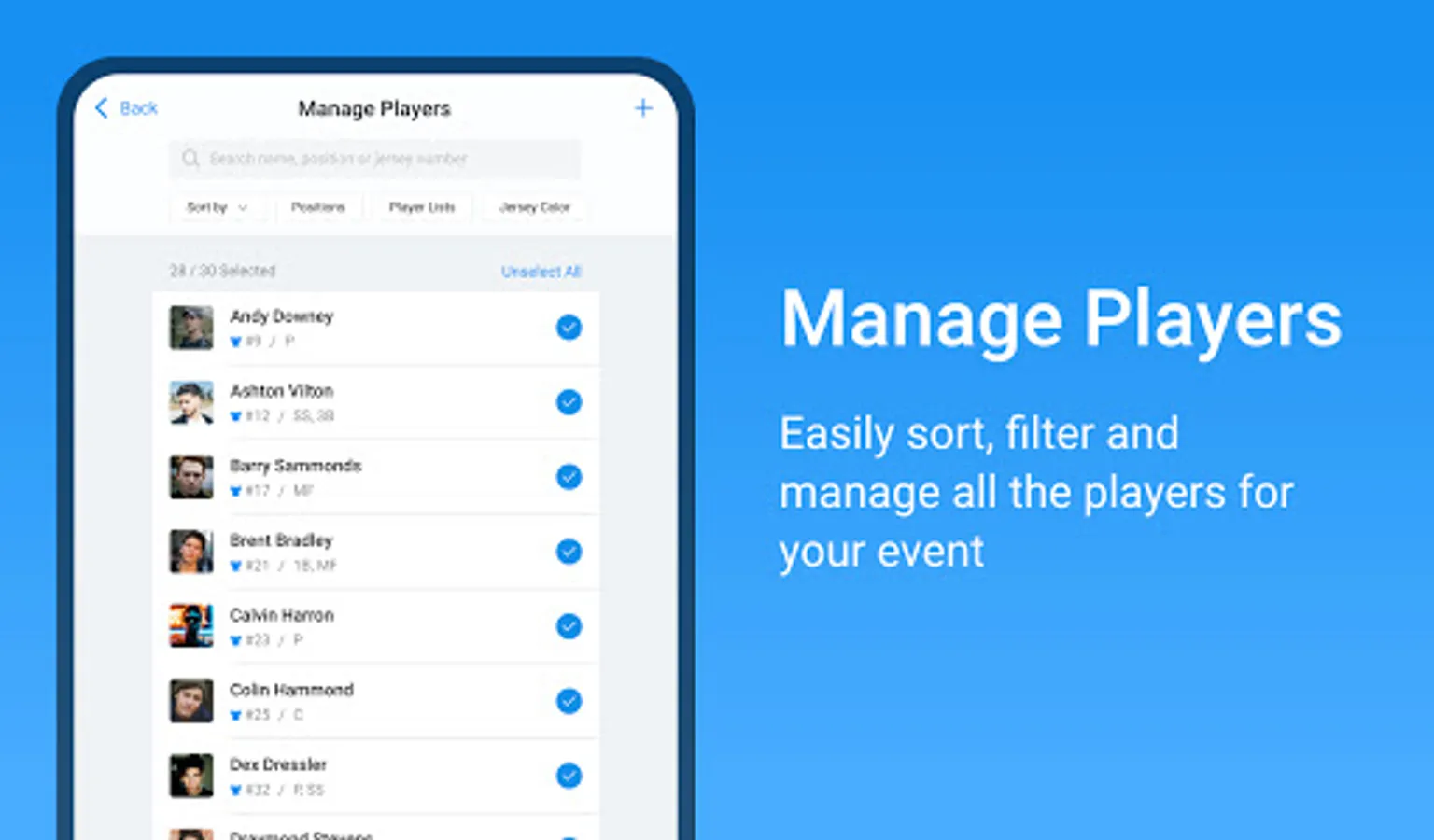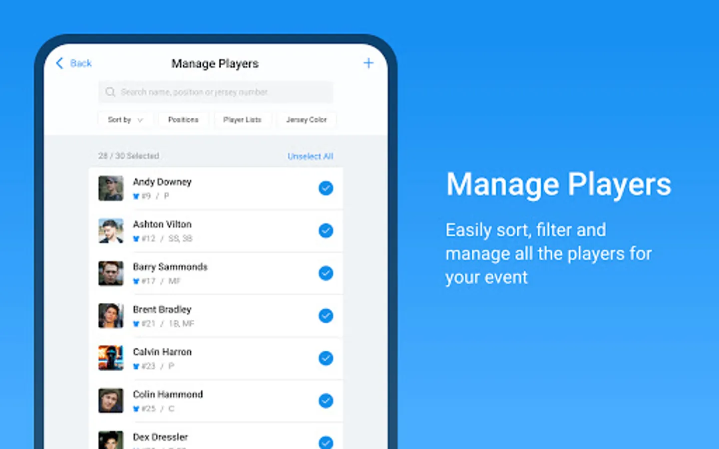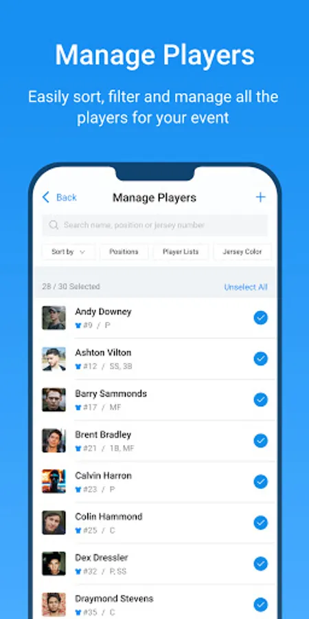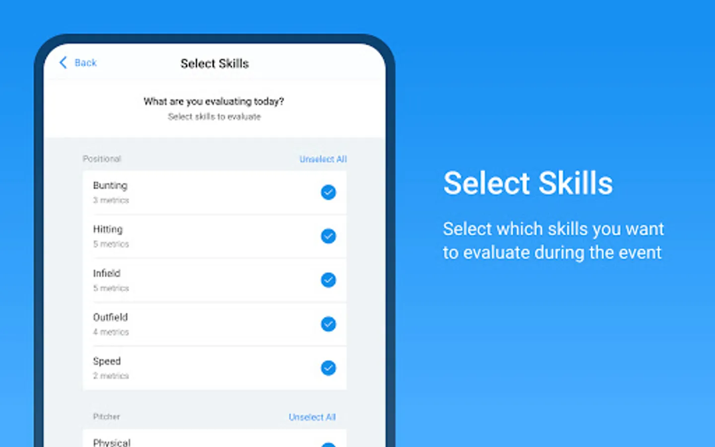 Once players have been added, and an event is created, the evaluators can use the app from the Google Play Store to input athlete data.