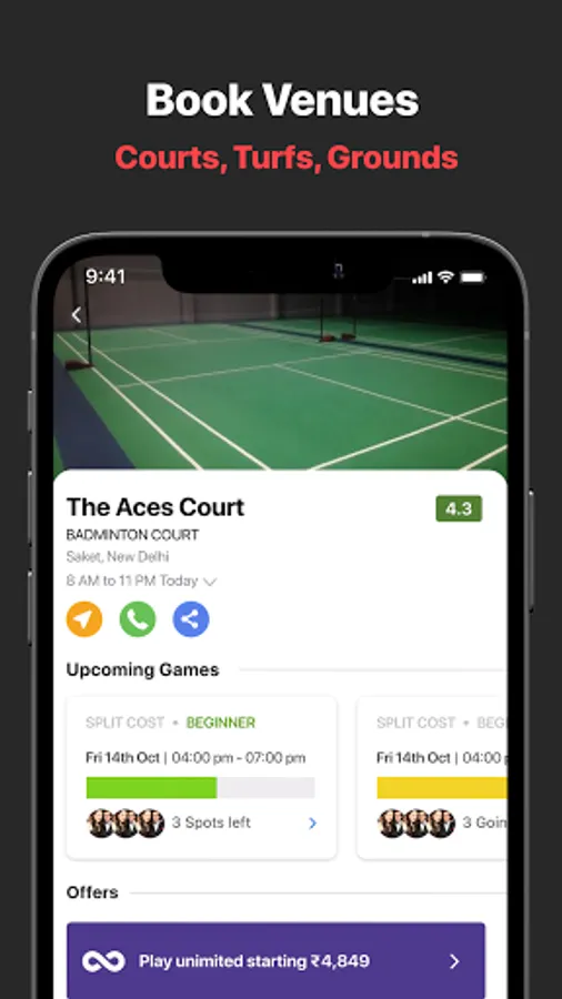 Finding sports venues nearby has never been easier. Whether you are looking for Badminton courts, Cricket grounds, Swimming pools, Tennis courts, Basketball courts, Football Turfs or any other venue nearby its much easier to book with Sportido. Select your time and date on the app and if the place is available simply book through the app additionally get great discounts.