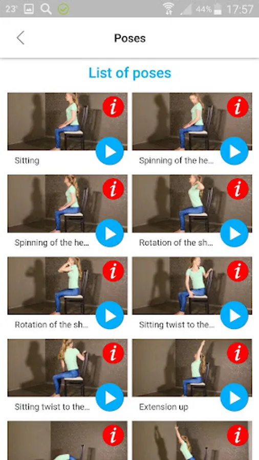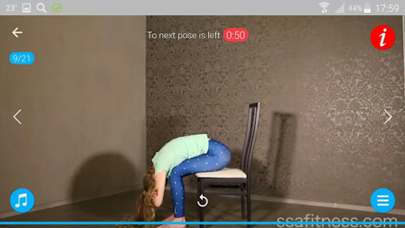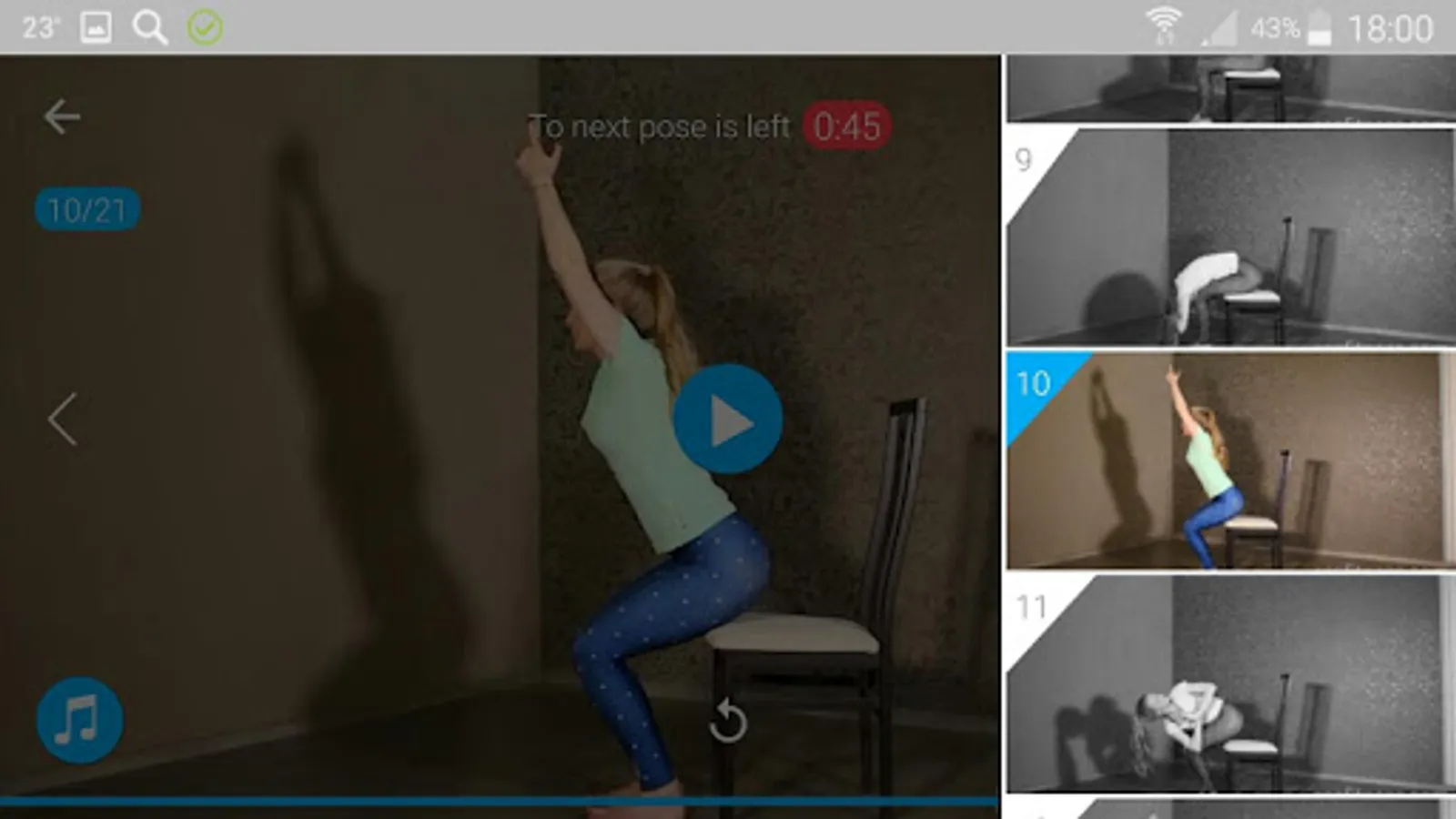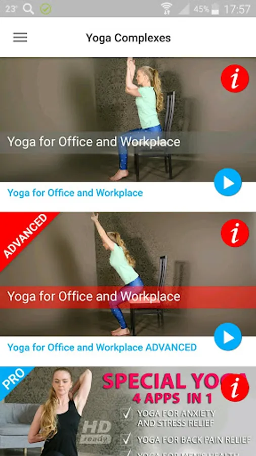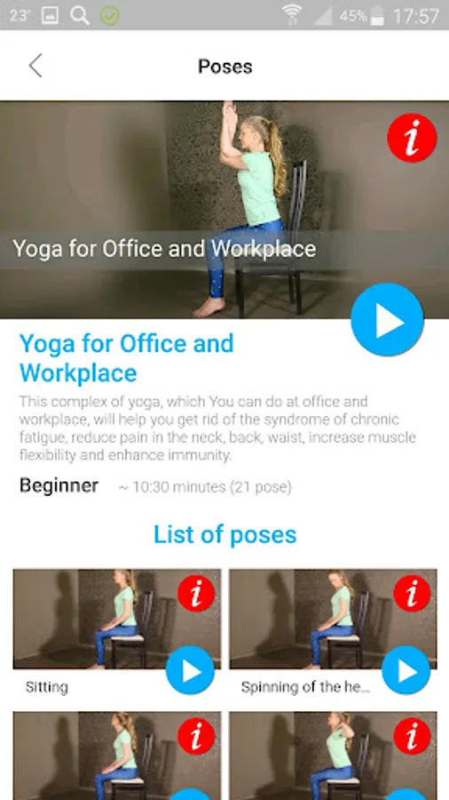 The app includes daily yoga asanas for office that will help you removal of chronic fatigue syndrome, pain in neck, back, waist, increase of muscle flexibility, strengthening of immunity.