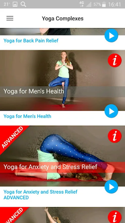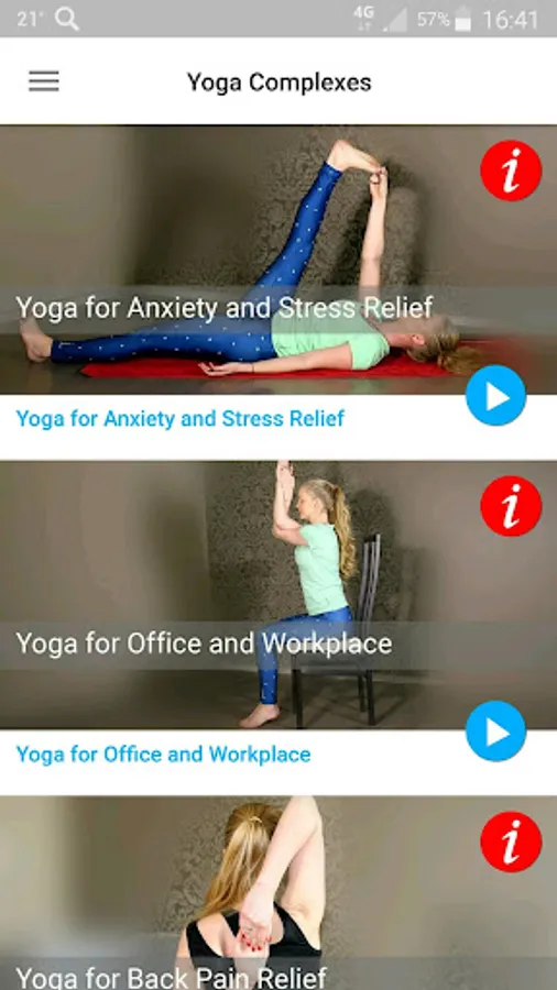 The application "Special Yoga" is designed for studying at home, in the office or in the gym. The application contains five yoga complexes: yoga for men's health, yoga for stress and anxiety relief, yoga for office and workplace, yoga for relief of spinal pain, yoga for weight loss.