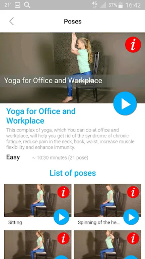 The yoga complex for office and workplace contains 21 asanas, which you can conveniently practice at the workplace. This complex will help you get rid of the syndrome of chronic fatigue, reduce pain in the neck, back, waist, increase muscle flexibility and enhance immunity.