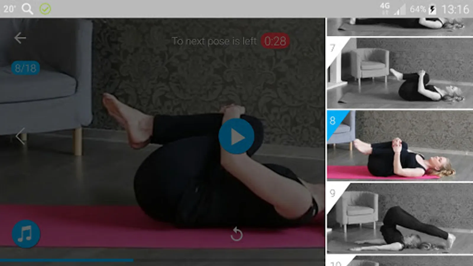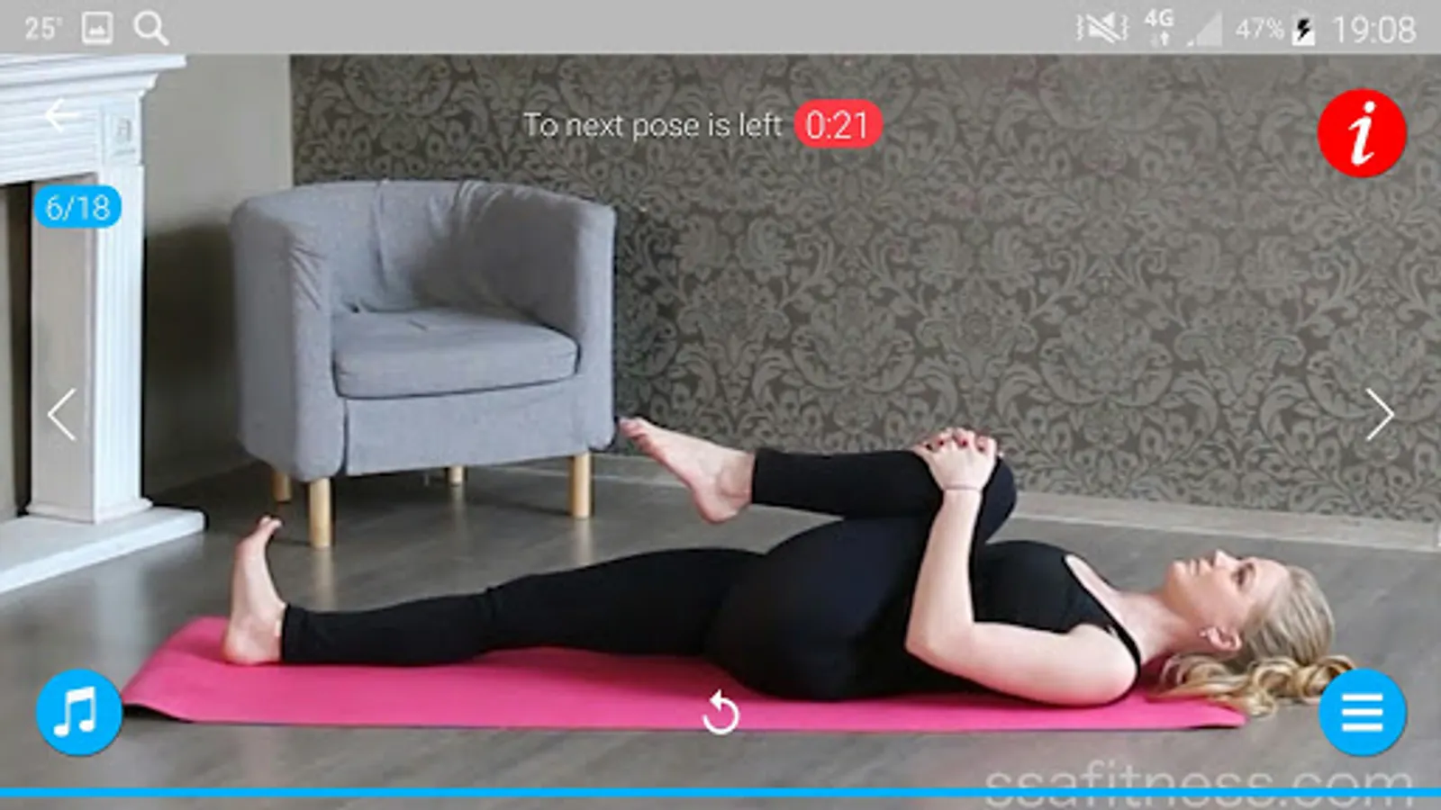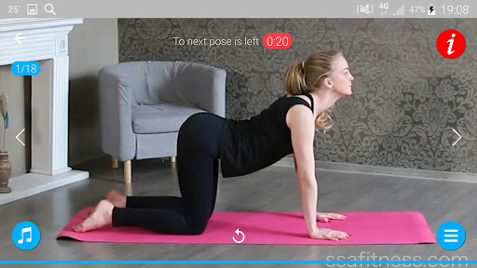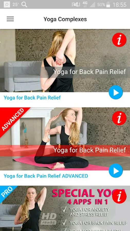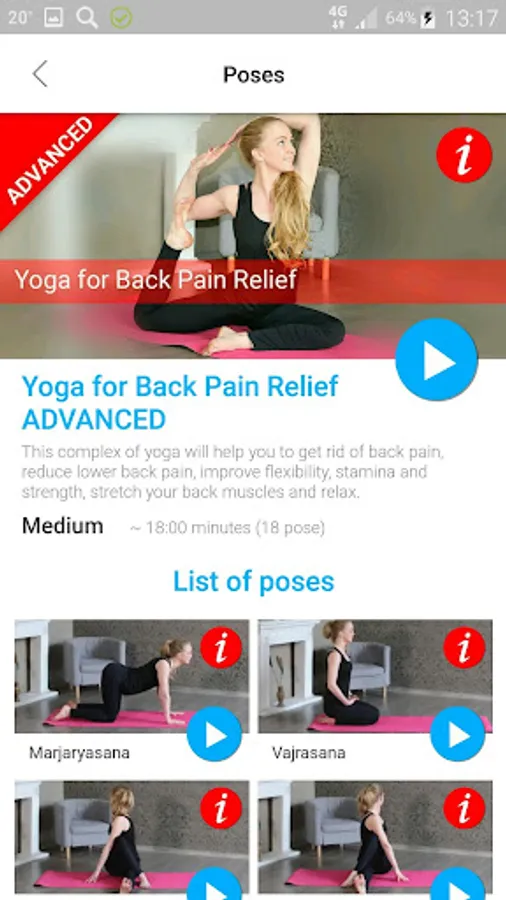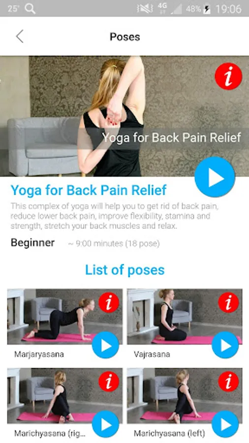 App with yoga poses, is designed to home workout, includes asanas, which will help you to get rid of back pain, reduce lower back pain, improve flexibility and stretch your muscles.