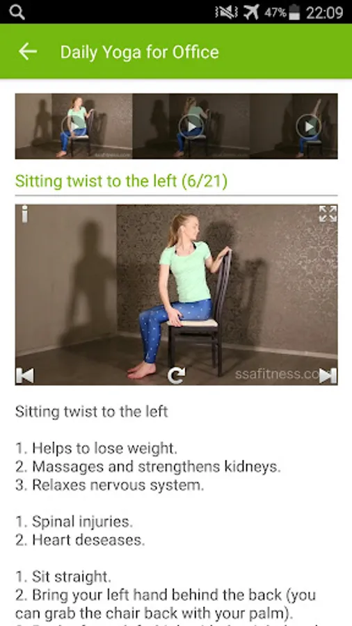 70% of modern people spend more than half of their active day in the office. Therefore the problem of a businessman is a lack of time to do sports and maintain health. By the end of the working week so much tiredness is accumulated that you need to spend your free time not on maintaining health, but on passive rest. If you recognize yourself in this description, the "Daily Yoga for Office" app is exactly what you need. From the moment you install it on your phone, you will no longer need to go to the gym for training. You can practice yoga while sitting on a chair with the same effect. A complete lesson is performed directly on the workplace. You spend a minimum of time and do not come off from the working process.