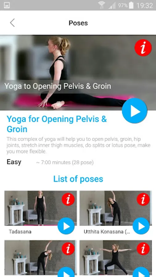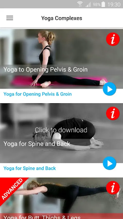 The application "Yoga for Full Body" is designed for studying at home or in the gym. The application contains four yoga complexes: