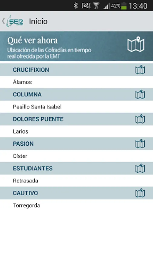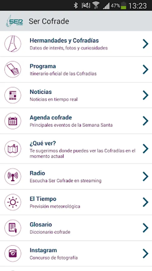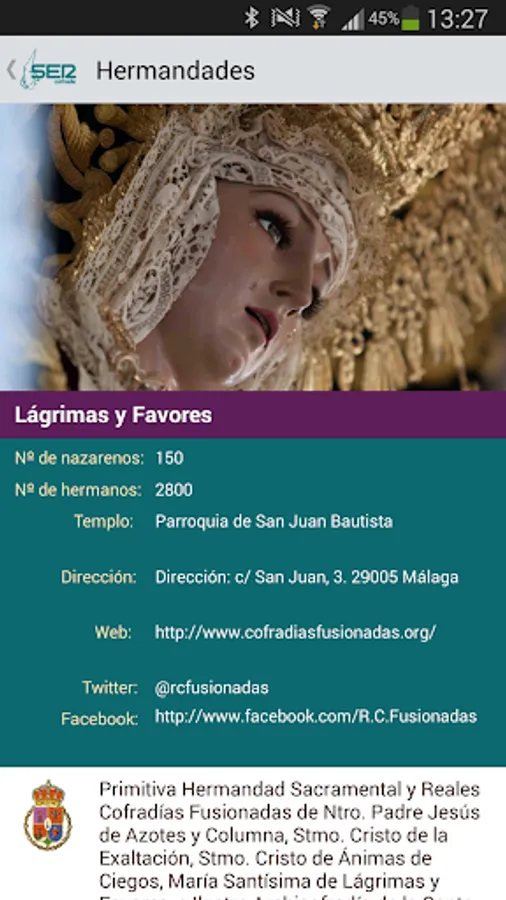 BE + COFRADE is an application to keep the Holy Week in Malaga real time. Geolocation features of all fraternities with which you can track your route at all times and calculate the distance that separates each procession. Listen live relay team Easter Malaga La Cadena SER. Detailed information of each Guild or Brotherhood, the releases this year, not to be missed moments every good brother, a glossary of terms brethren, and an original news photo contest for its users through Instagram.