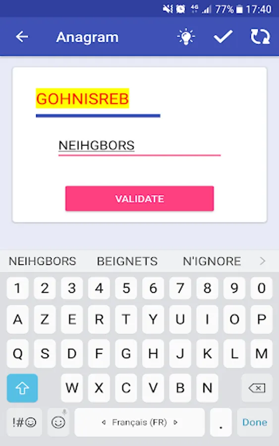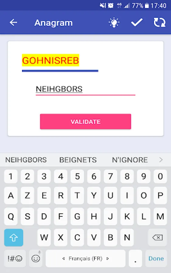 Try to find the maximum of words to be the king of Anagram and unlocking all the achievements. Reaching the top of the leaderboards (most points scored, most words found and most games played) will be also a big challenge.
