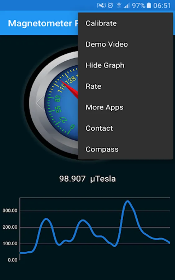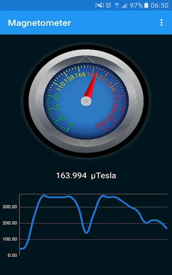 A Gauge helps you to see the magnetic value that is also displayed in textual mode. The magnetic value is presented in µT (Microtesla). A graph shows you also the recent magnetic field activity.