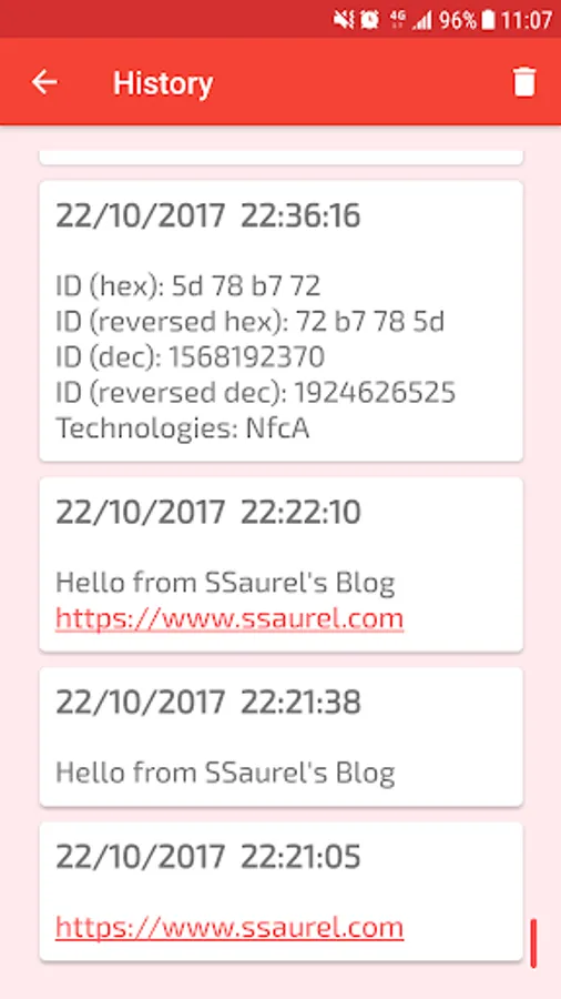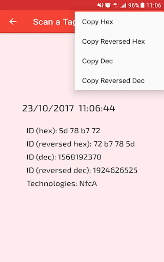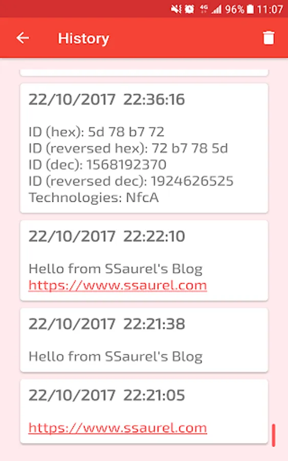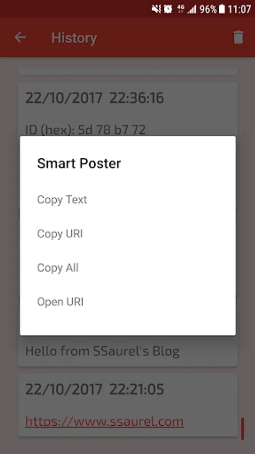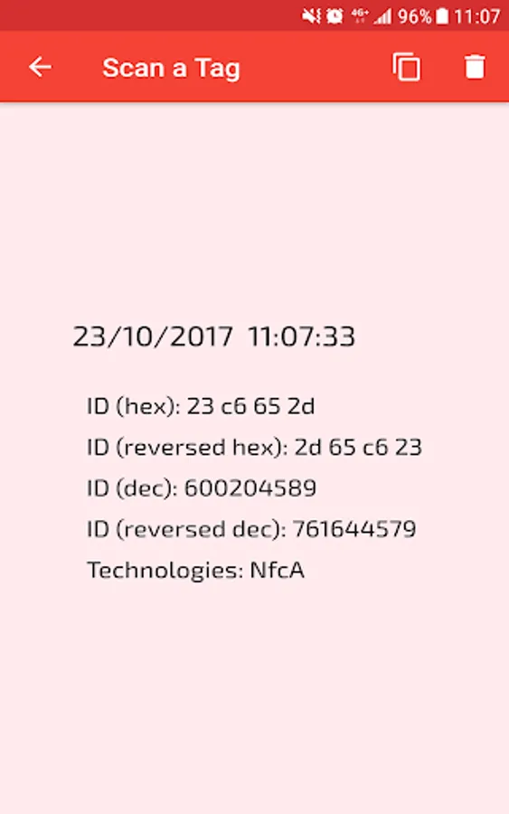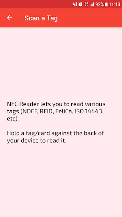 To use NFC Reader, you have just to hold a tag or a card against the back of your device to read it. NFC Reader lets you to copy the content of the tag or to open the URI. You can also manage the tags and cards previously scanned in the History section.