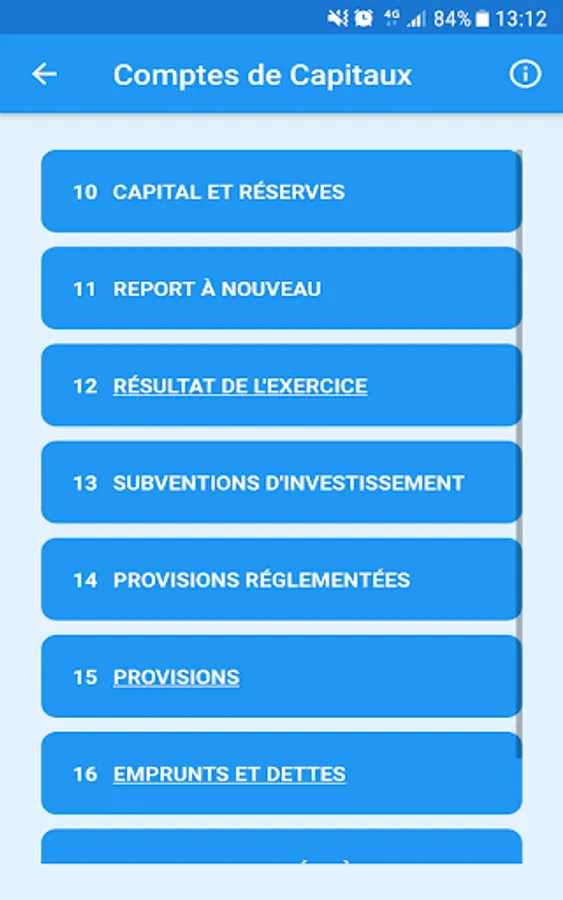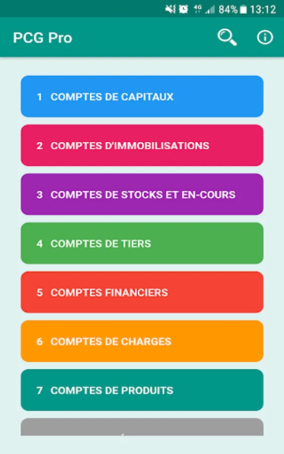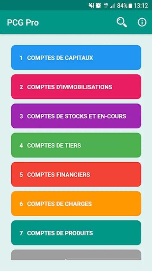 L'application PCG Pro vous propose la liste intégrale des comptes utilisés dans le plan de comptes en France au sein d'une interface moderne et agréable où chaque classe de comptes a une couleur propre :