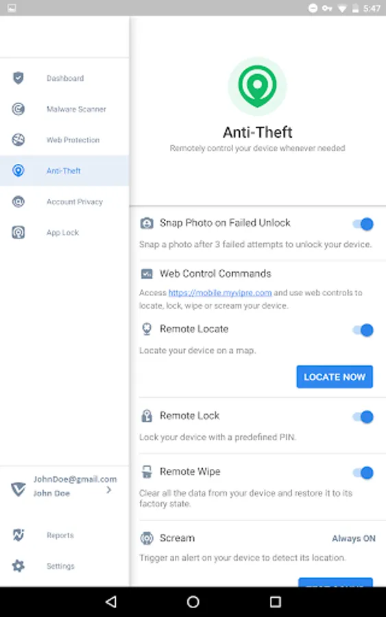 Lock, geo-locate, sound an alarm and wipe your Android from any Internet-connected device.