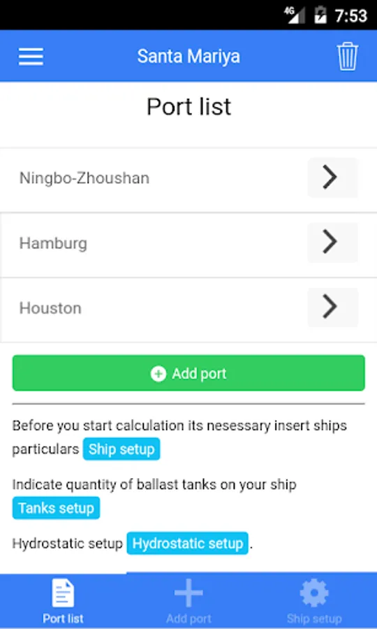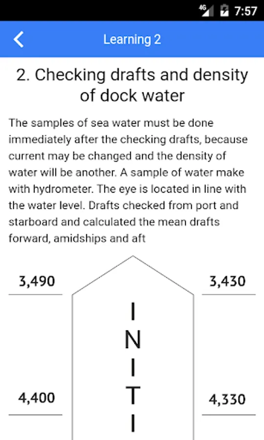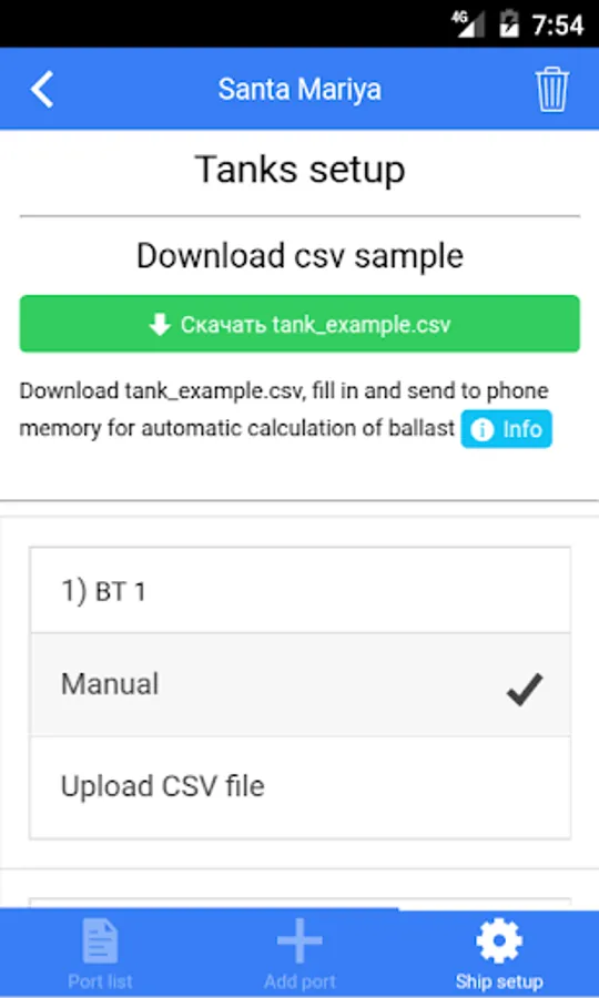 Now you do not need to use third-party resources. Moreover, by downloading once a csv file with ballast data from the application itself in memory of your phone, interpolation will be automatic. You will need to specify only sounding in the tank.