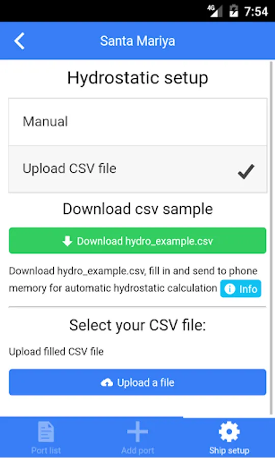 There is a possibility of manual and automatic calculation of the hydrostatic data by adding a csv file. All you need to automate the calculation of Hydrostatics - download an empty file from the program, fill it on the computer with the data of your vessel and upload file through the program.