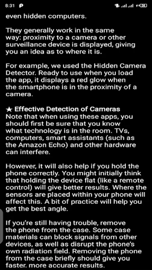 This Hidden camera detectors Spy hidden camera 2019 analyses magnetic activity based on readings from magnetic sensor of your android device. Some type of metals depending on their length, material and temperature may exhibit same magnetic activity as that of camera. In that case app may beep. But sometime metals that have very weak electromagnetism, so the app ignore that. Camera spy has special method of finding nanny cam or spy cam. This hidden camera app analyses the magnetic activity around the device. If magnetic activity seems similar to that of camera, the app will beep and raise alarm for you so that you can further investigate.