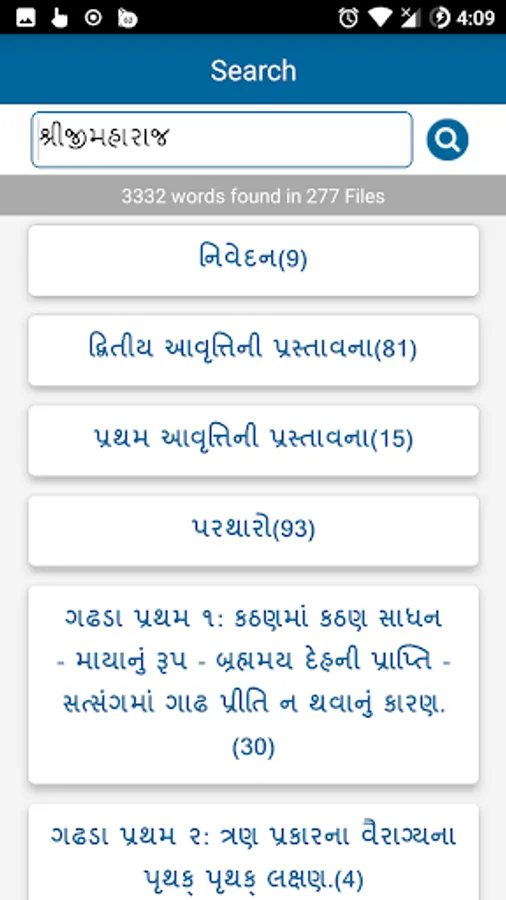 - Search the whole Vachanmarut. Gives result with count occurring in each Vachanamrut.