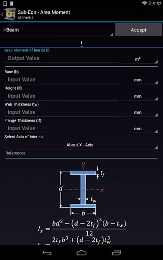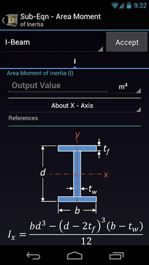 Simplify your calculations with built-in cross-section property calculators for a wide variety of standard shapes and never have to calculate area (A), area moment of inertia (I) or polar moment of inertia (J) by hand again. All you need to press is the |Sub| button beside the cross-section property of interest.