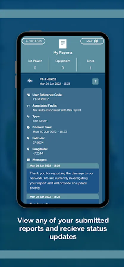The app displays pins on a map overlay showing areas affected by current power cuts. Tapping on this pin gives you a link to more information about the problem. Power Track also provides a summary list of reported power cuts.