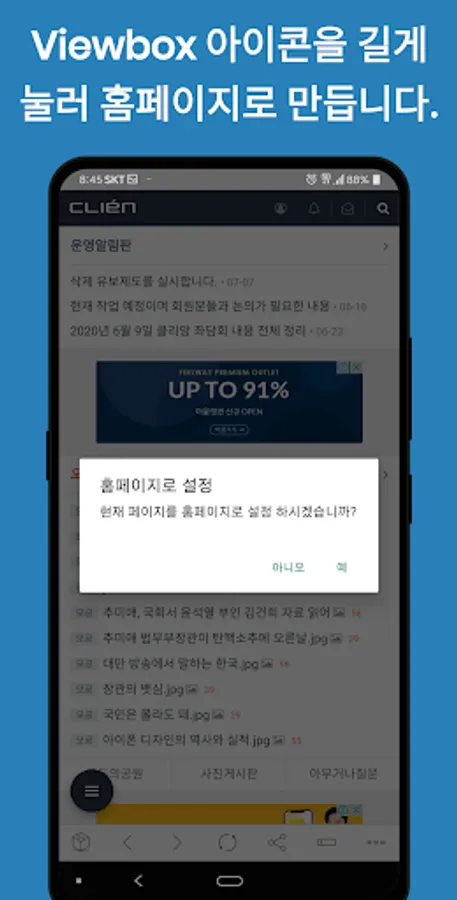 * If you install for the first time, homepage is not registered. First, browse to the desired website and click the 'View Box' icon on the bottom bar.