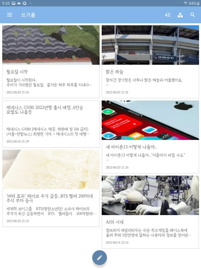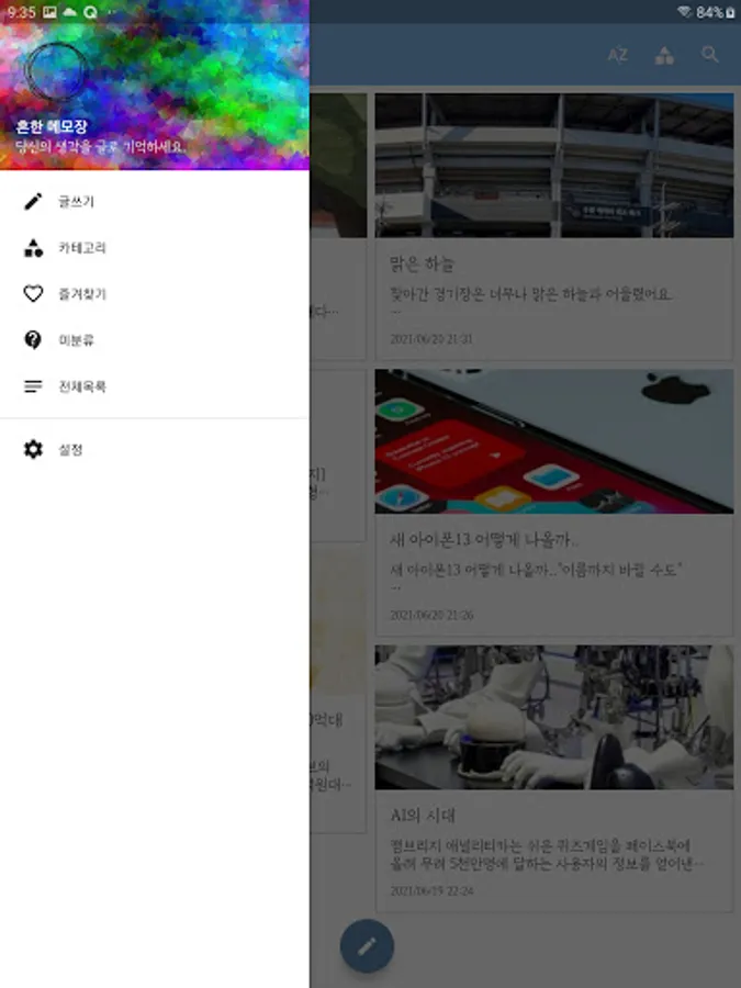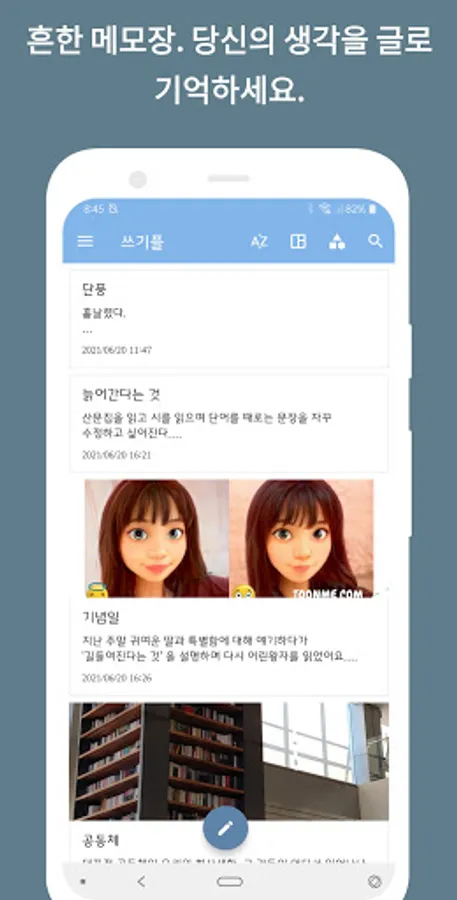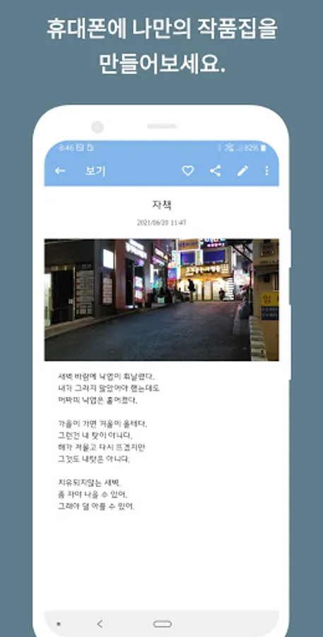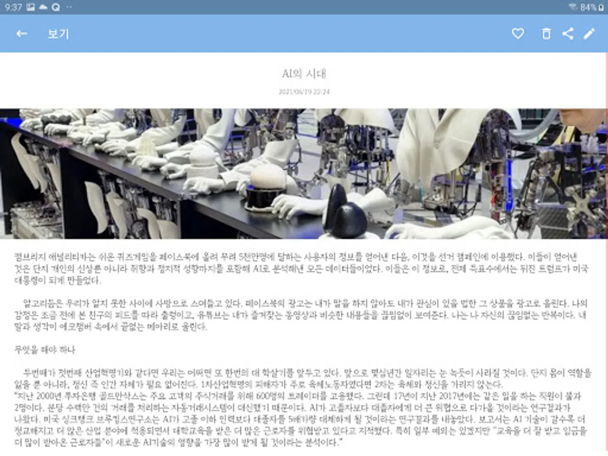 . You can share your writing and distribute it to other places to save it. A long press saves only the text, and a short press delivers the title and writing time.