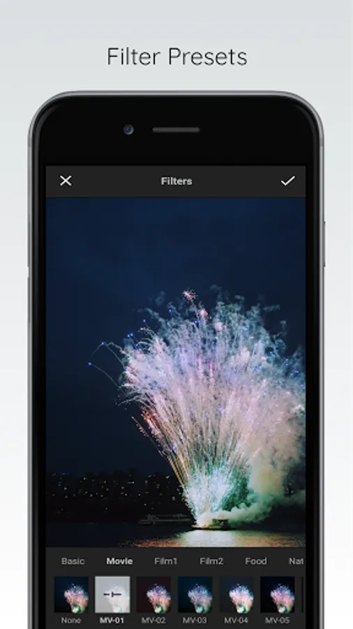 Apply various filter effects such as season, food, cinematic, film, and more.