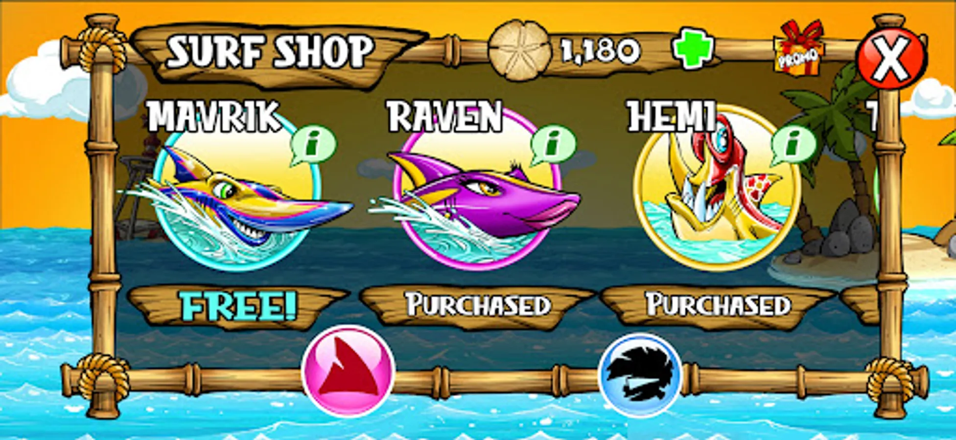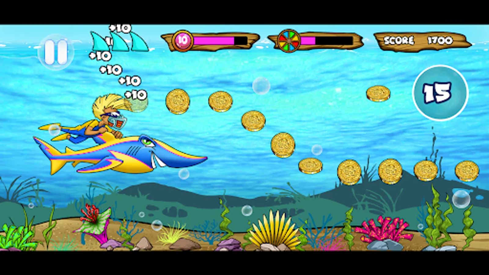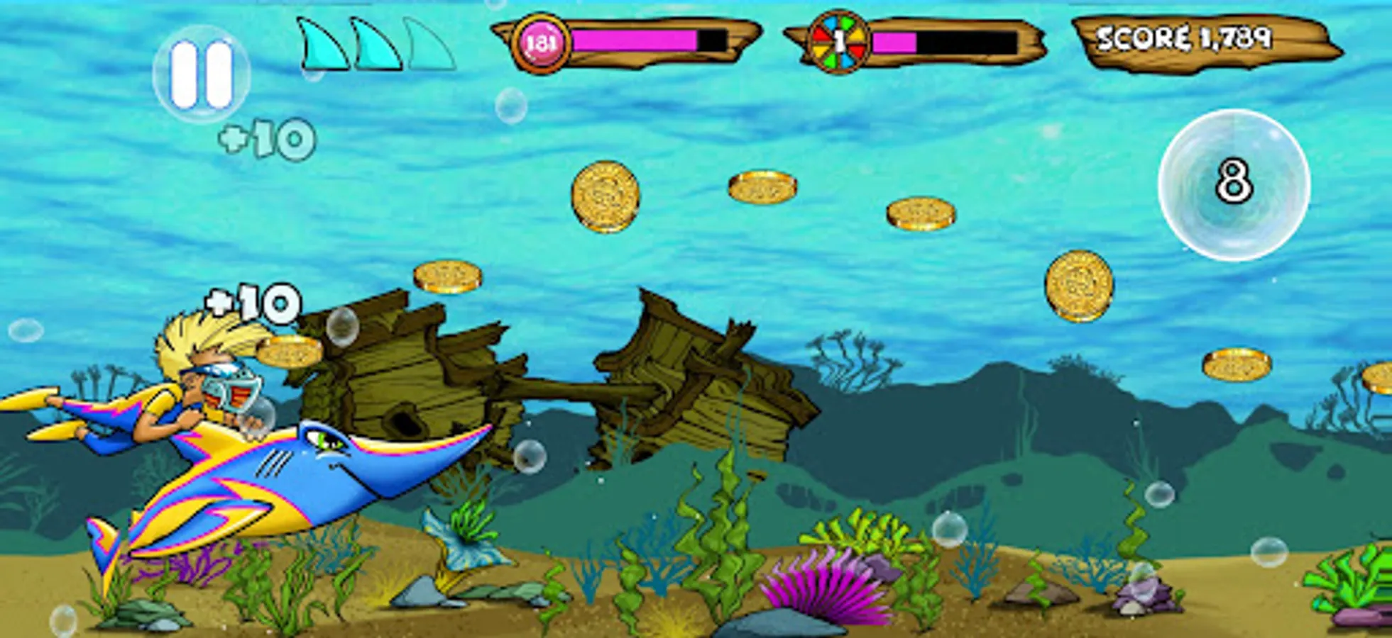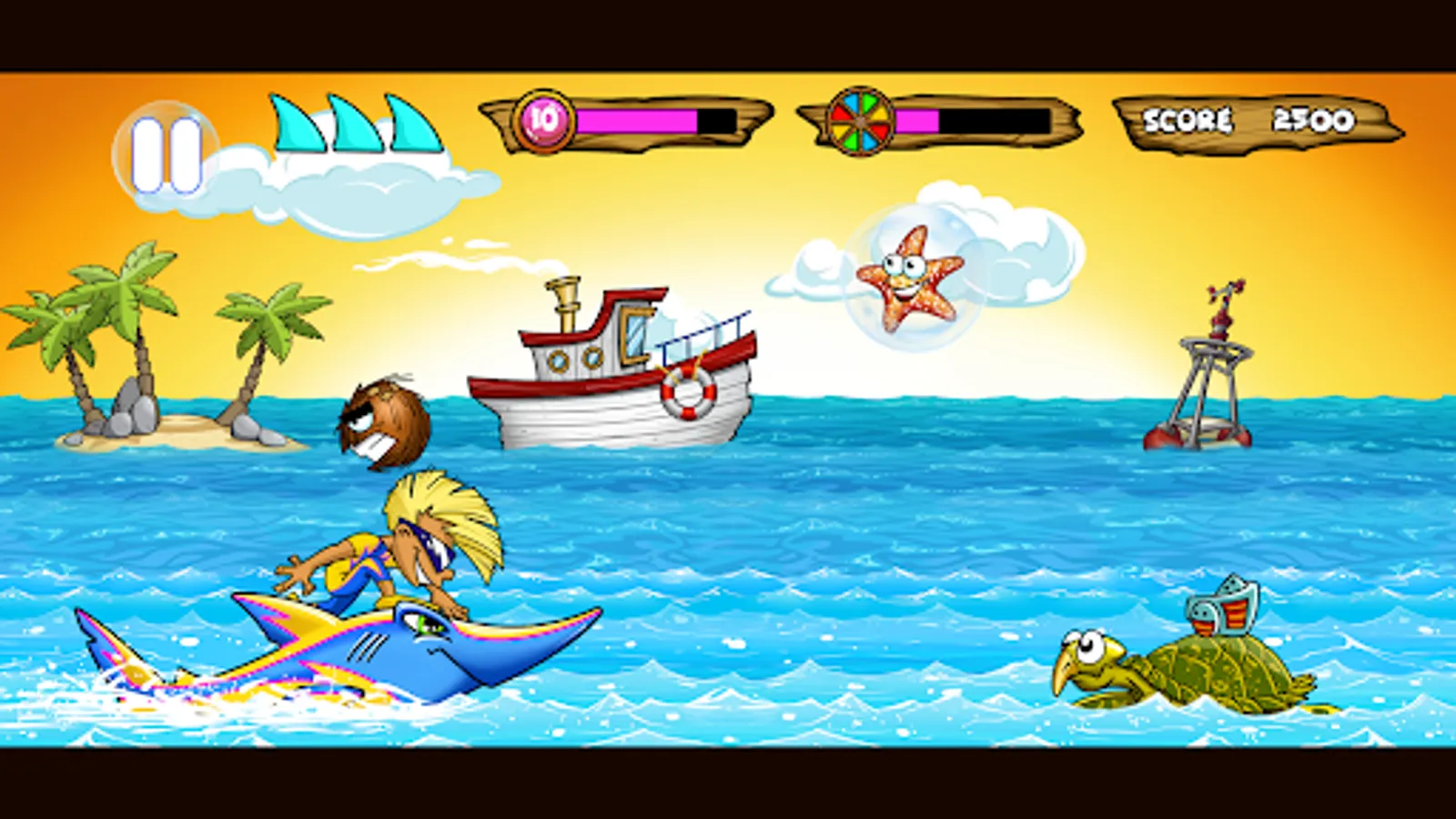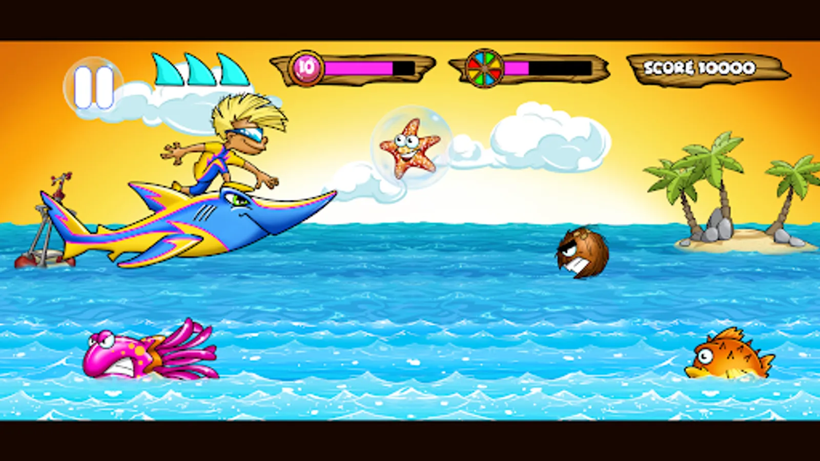 The surf fun doesn’t stop ON the water! Wade the “Wiz” has made a special mask for the surfers to go underwater and breathe like fish! Collect this special mask to go UNDER water with your shark! Collect as many coins as you can for added points and increased score! Grab them ALL and earn a super BONUS!