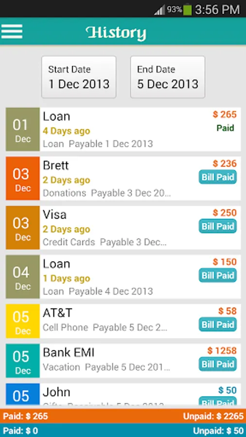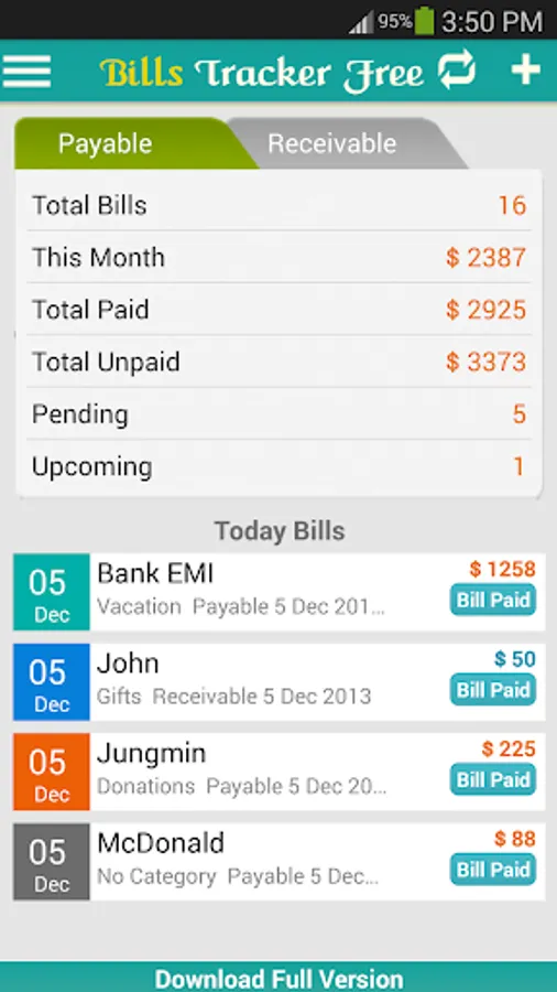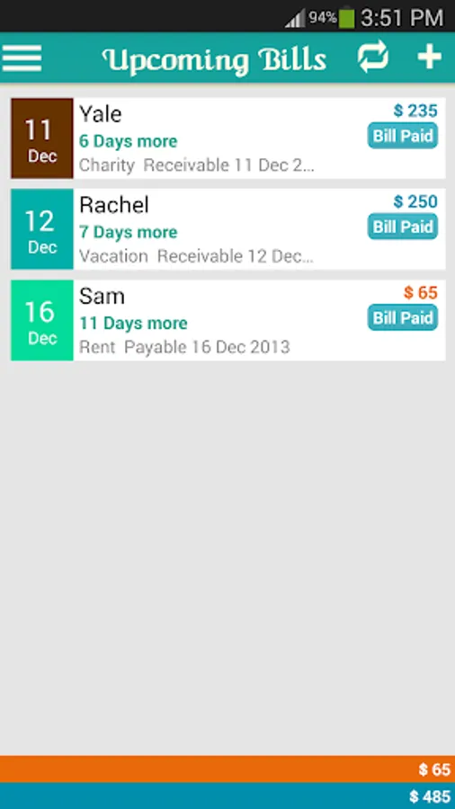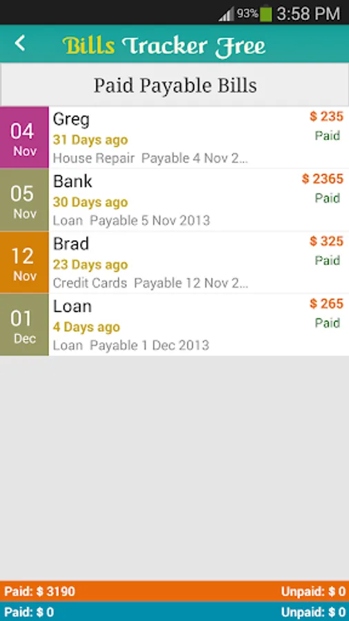 - Bill Paid Button on each unpaid bill to mark bill as paid