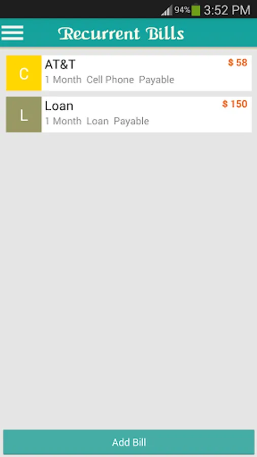 - Recurrent Bills : Weekly, 2 Weeks, 3 Weeks, 4 Weeks, 5 Weeks, 6 Weeks, 7 Weeks, 8 Weeks, Monthly, 2 Months, 3 Months, 6 Months, Yearly