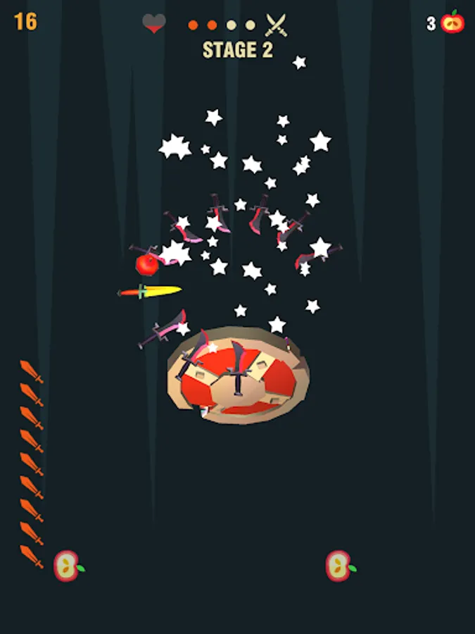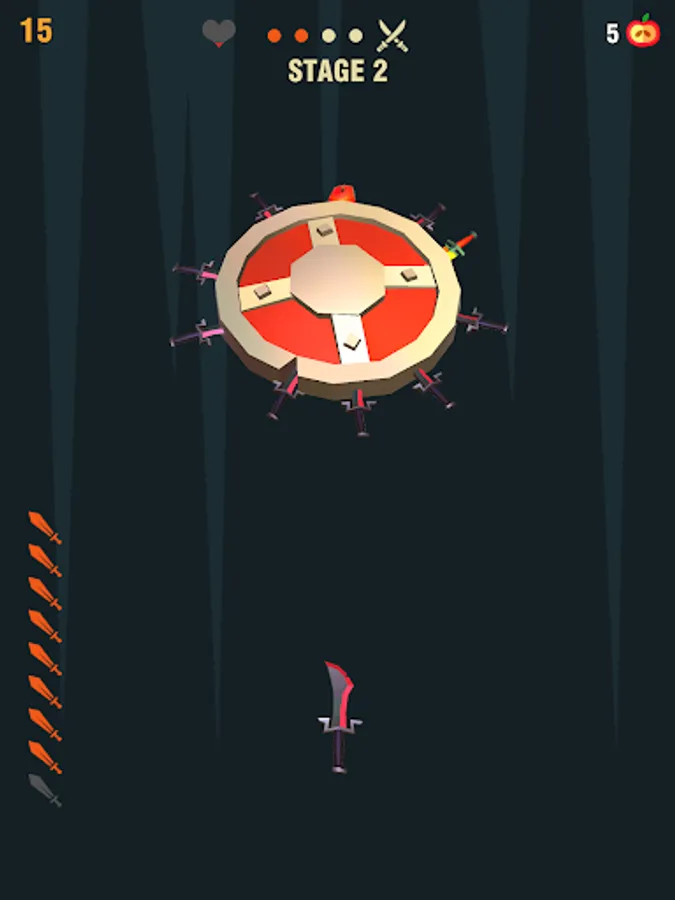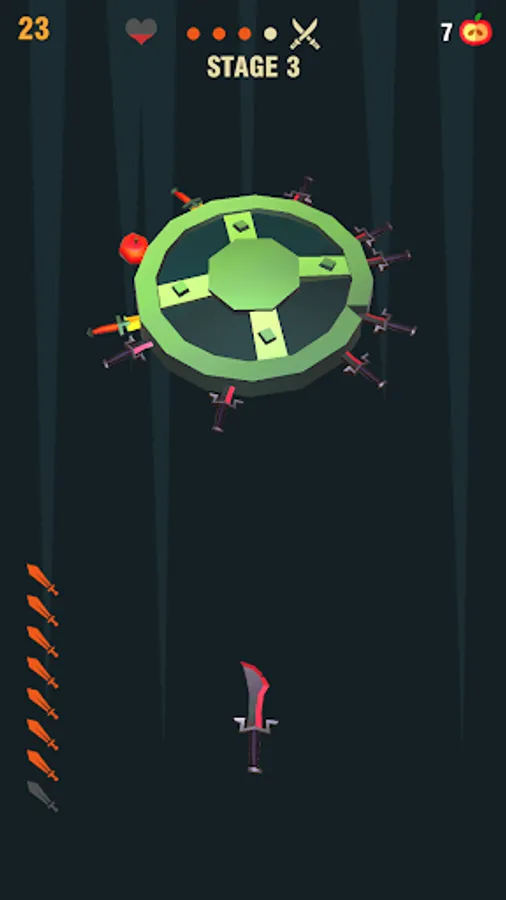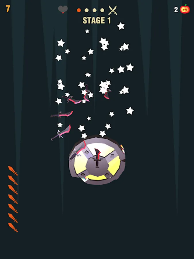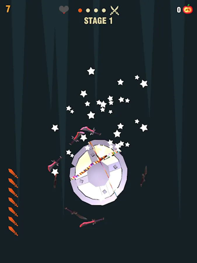 Insert the knife into the shield in succession to break it.Cut the apple open and get a new knife.Every fifth stage has a BOOS - beat them, become the king of flying sword!