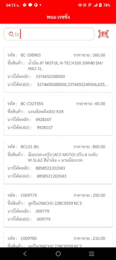 An application for scanning barcodes, searching for products, product prices and checking stock of Panom Racing Co., Ltd. related to selling parts and accessories of motorcycles. for convenience fast in service Information about products and services in motorcycle spare parts