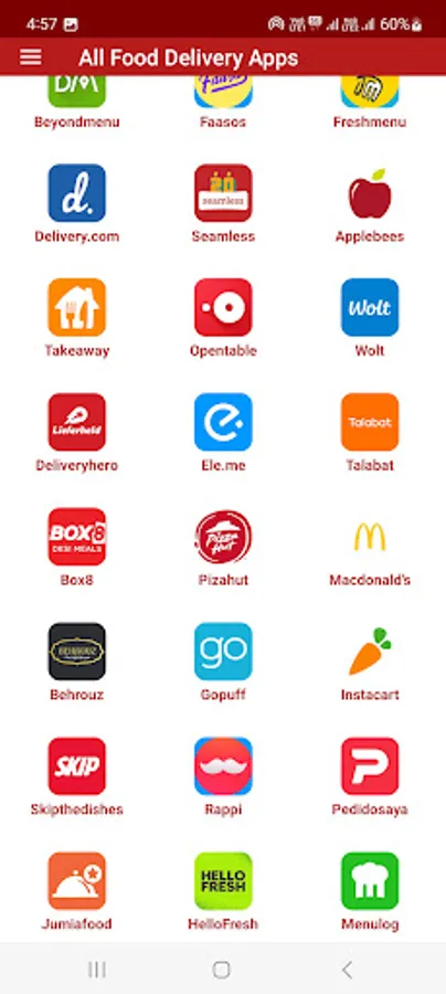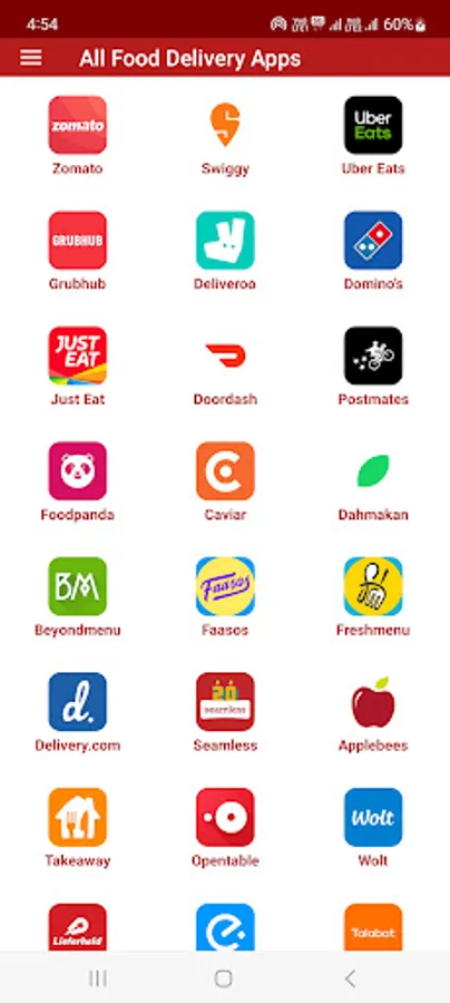 Apps that deliver food like like Zomato Restaurant Finder and Food Delivery App, Swiggy Food Order And Delivery, Domino's Pizza Online Delivery, Pizza Hut Pizza Delivery Order Food, Uber Eats, Deliveroo Takeaway food, Just Eat, Jumia Food Local Food Delivery near You, goPuff Drink and Food Delivery, McDonald's, PedidosYa, Rappi, OpenTable Restaurants Near Me, BeyondMenu, BOX8 - Order Food Online, FAASOS, LIEFERHELD, eleme, dahmakan, Flipkart, Grofers, Talabat, Amazon, etc.
