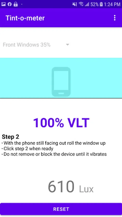 Tint-o-meter is a simple app to test the Vlt percentage of your tint.