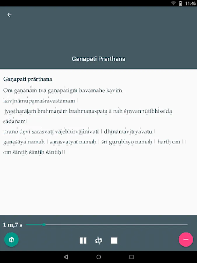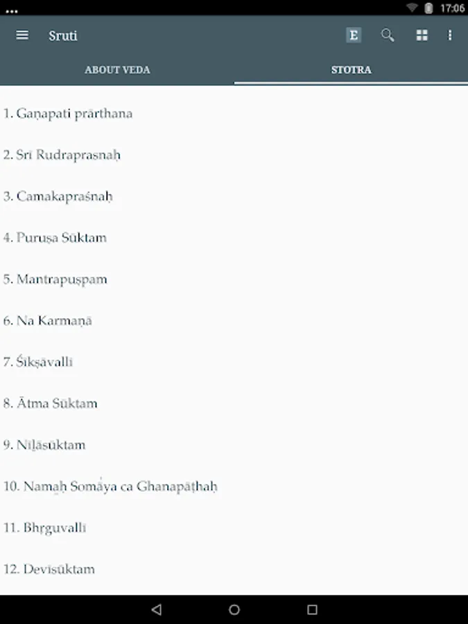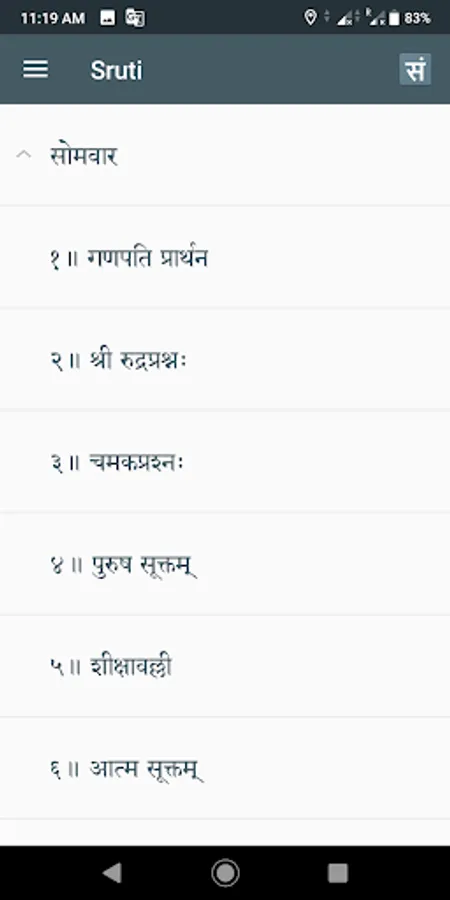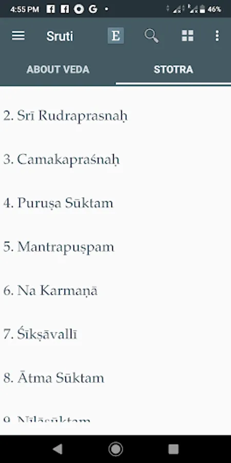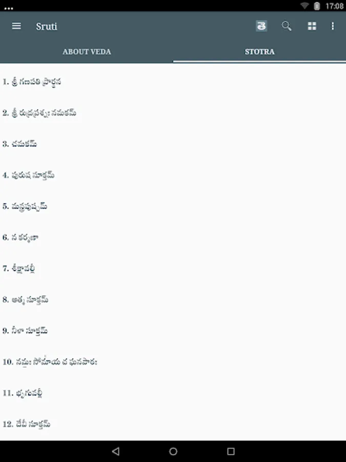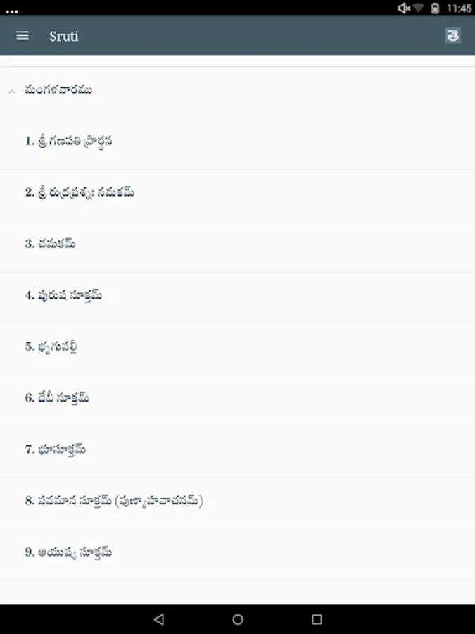 Sruti contains Mantras chanted in the Prasanthi Mandir. The speciality of this application is that it supports audio of Mantras with transliteration and intonation in multiple languages. The current version supports English, Sanskrit and Telugu languages with intonation and Malayalam without intonation.