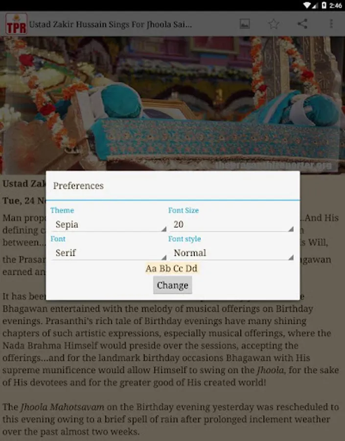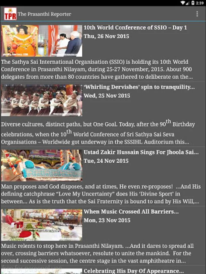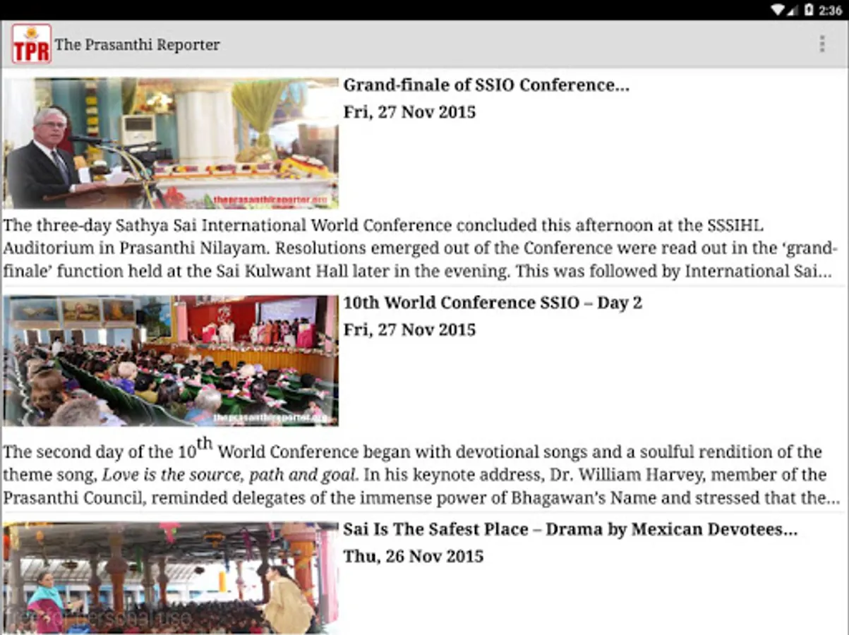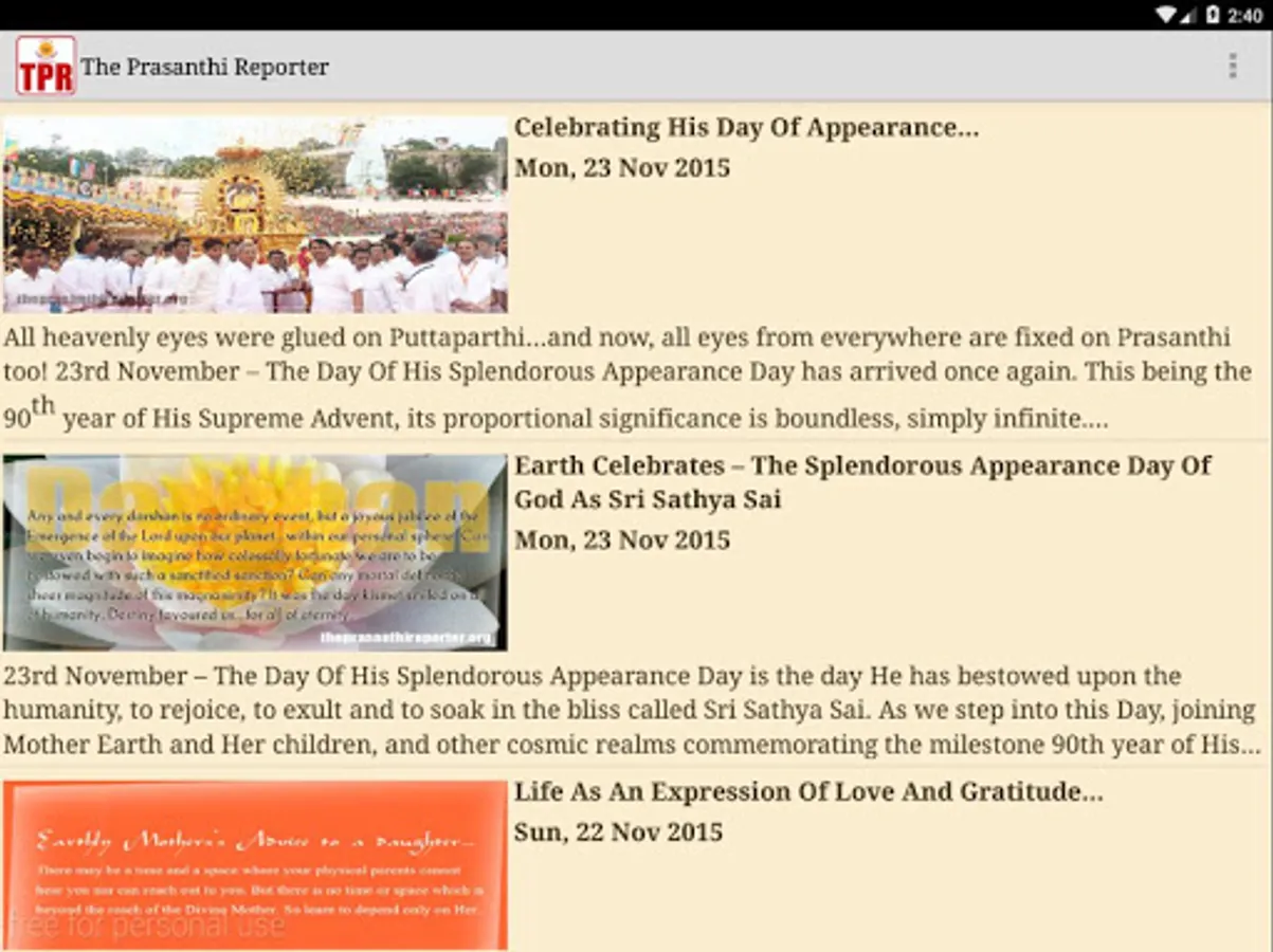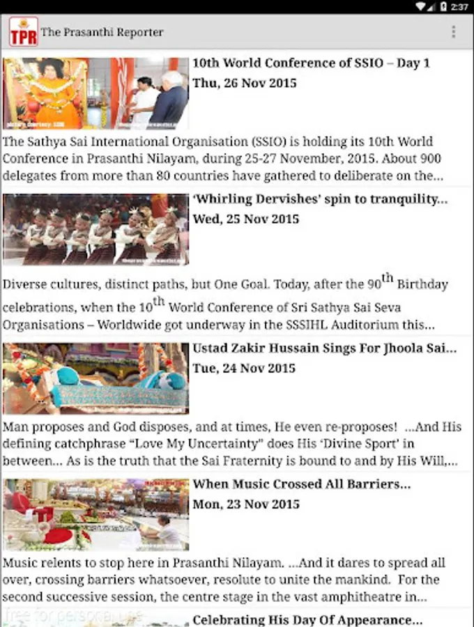 To further these efforts by adopting modern media of communication, it is our great privilege to present this humble offering at the lotus feet of Bhagawan. This TPR Android application has been designed to run on devices with Kitkat and higher operating system versions. It brings the wonderful atmosphere and bliss of Prasanthi Nilayam to you, wherever you may be. Devoutly follow the festivities, dramas, and programmes in Sai Kulwant Hall and important events that take place in the Sai community. All this on your Android device.
