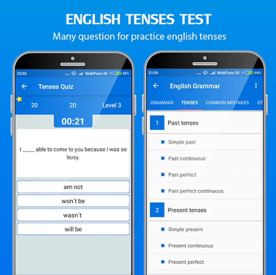 - Many question about grammar tenses: Present, past and future tense.