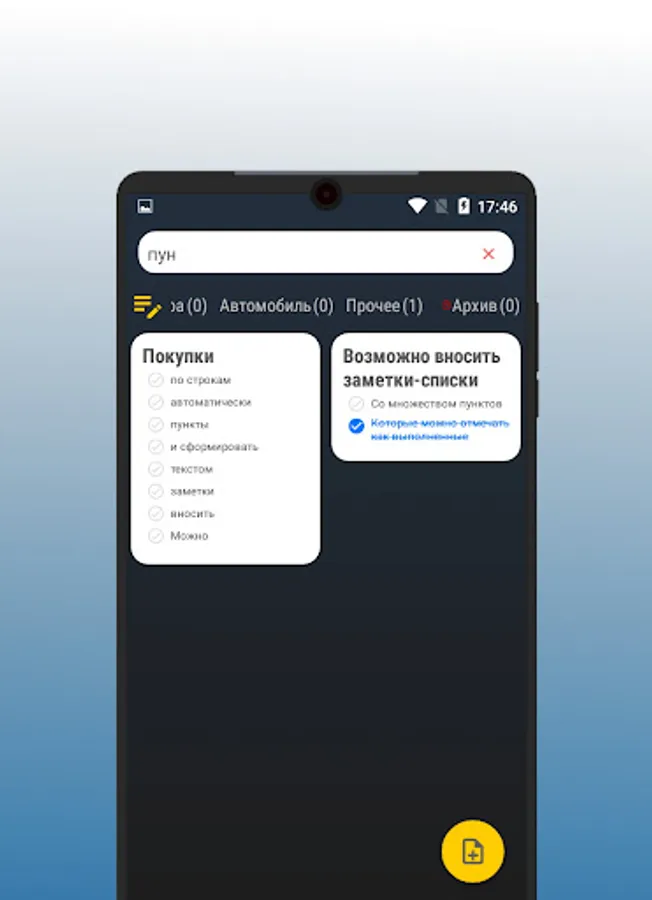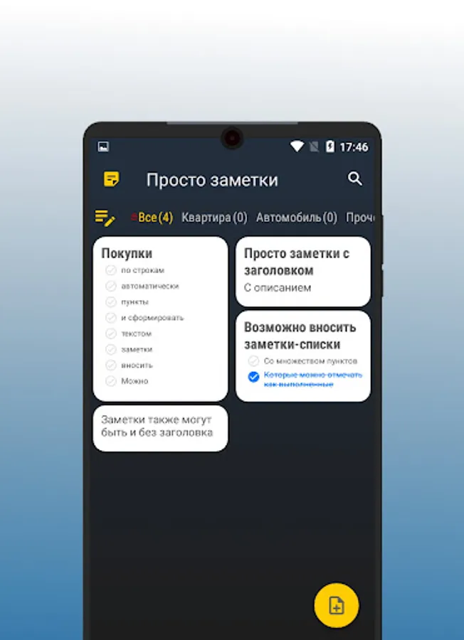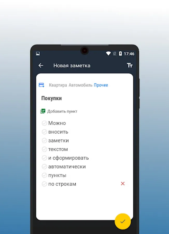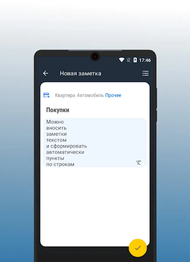 You can add simple text notes with a title or list notes with the ability to quickly mark progress.