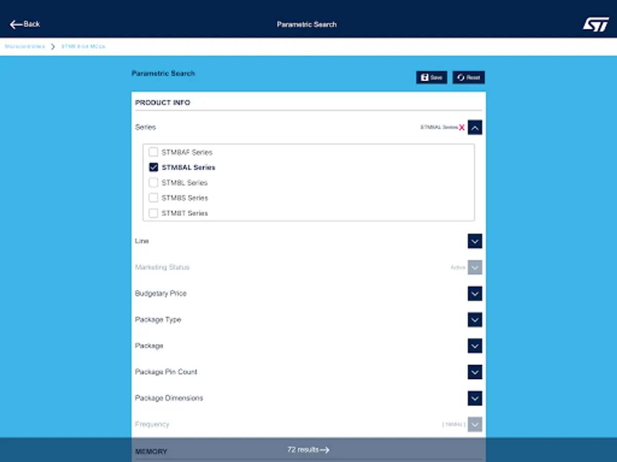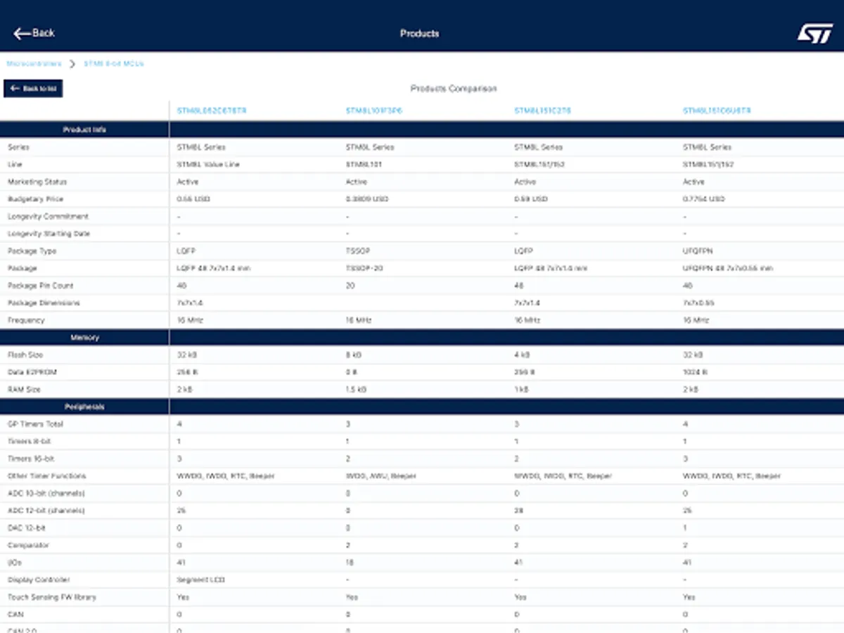 STM8 Finder features easy-to-use selection tools that provide you direct access to documentation, and a connection to MCU communities. You will find the microcontroller or development board part number that best fits your application thanks to an easy search with multiple criteria including core type, CPU frequency, memory, price, package, I/Os, temperature grade, and peripherals such as control, timers, analog, connectivity, multimedia and security. From the application, you will also have the possibility to directly buy devices or development boards on-line.