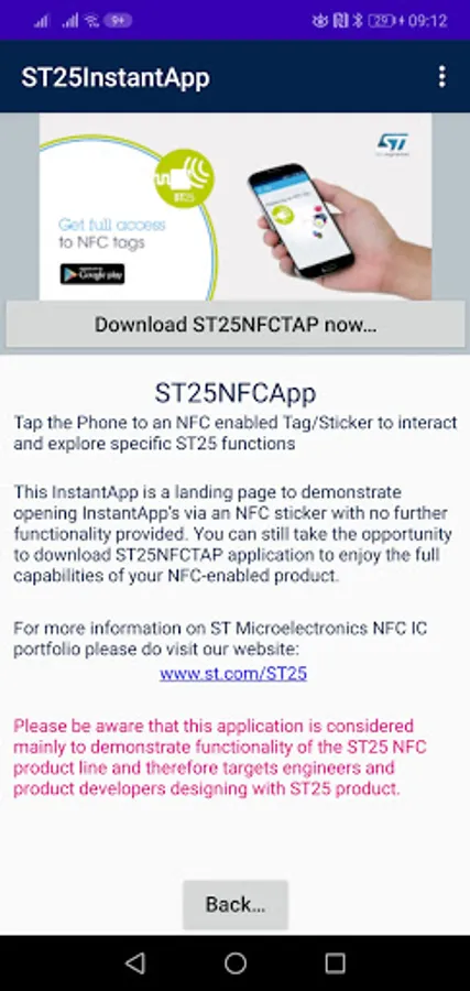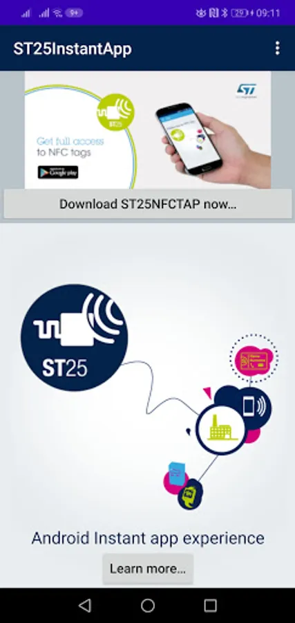 This InstantApp is a landing page to demonstrate opening InstantApp’s via an NFC sticker with no further functionality provided. You can still take the opportunity to download ST25NFCTAP application to enjoy the full capabilities of your NFC-enabled product.