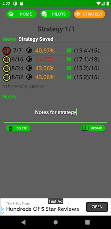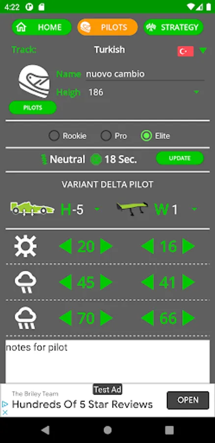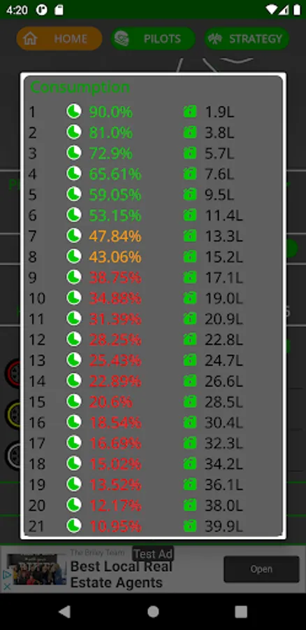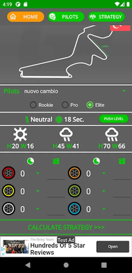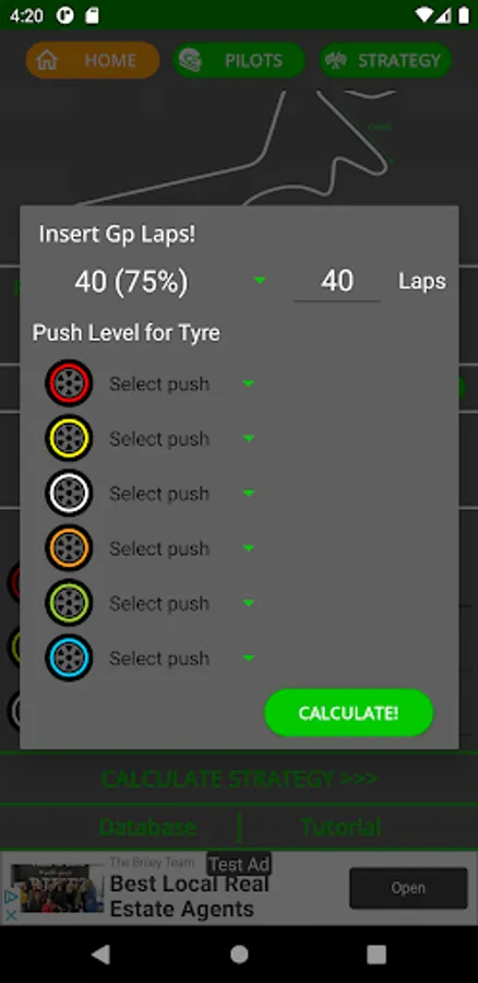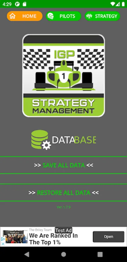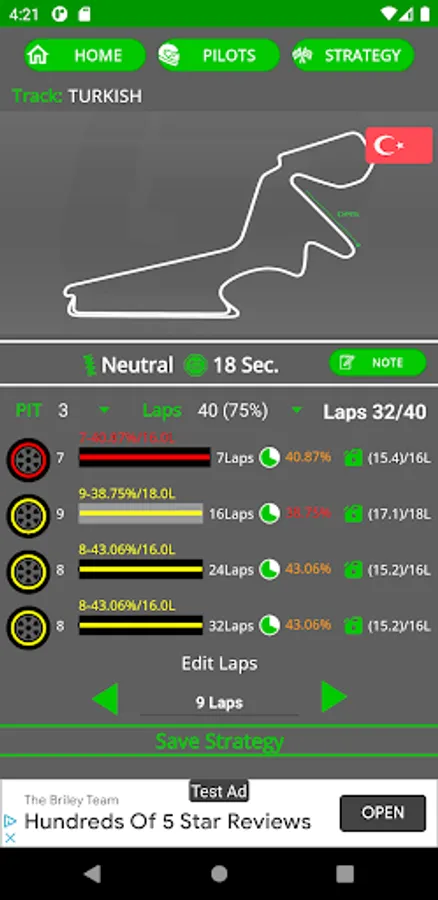 Performs calculations based on tire and fuel consumption. You can also consult the settings and duration of the Pit Stops for each circuit. For each circuit you can save your drivers' set-ups. You can also save your favorite strategies for each circuit. You can back up your data to restore it or move it to another device.