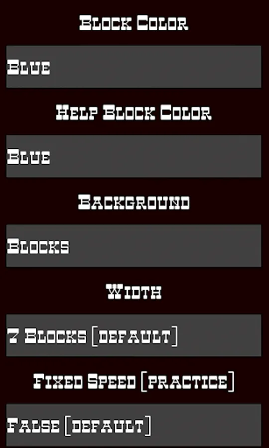 Option to change width, set a fixed speed for practice, change background and block colors.