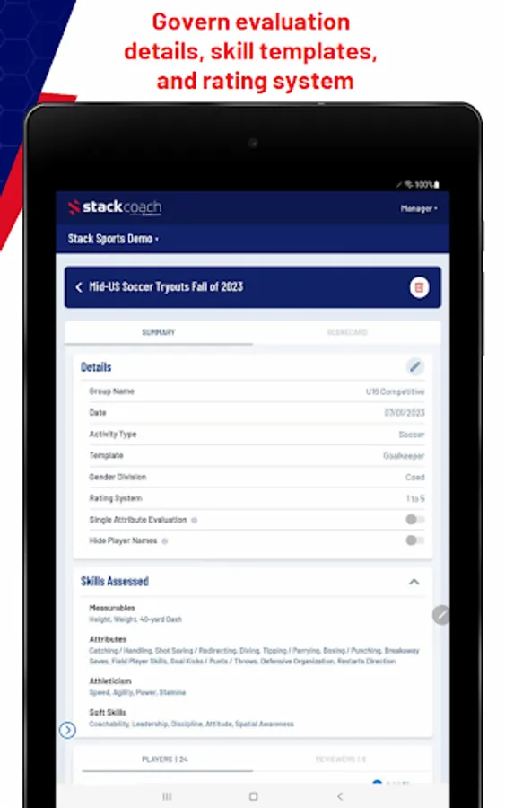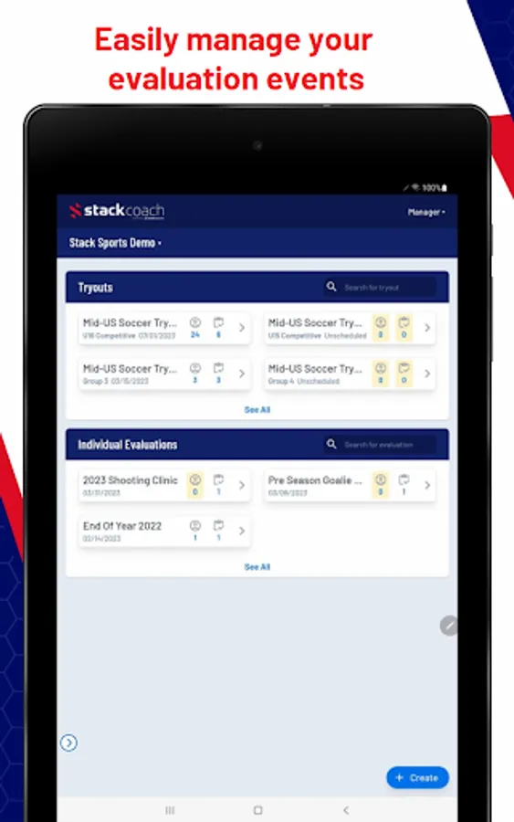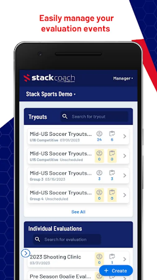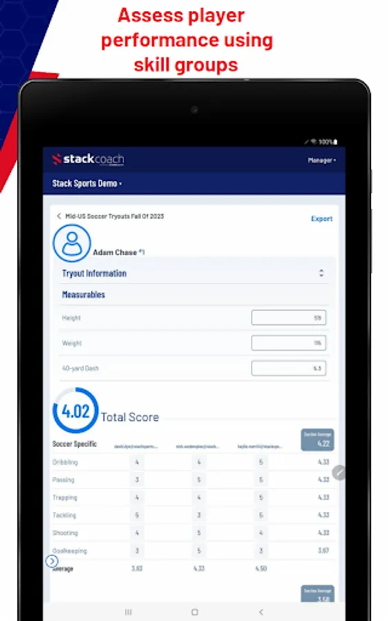 Stack Coach powered by Stack Sports, is a player evaluation and assessments app. Designed to be used by all levels of sports organizations to assess players’ strengths & areas for improvement. Stack Coach is the last assessment app you will ever need. Create tryout events based on organization, customize templates based on athlete skill level, and easily share results with coaches, parents, and athletes.