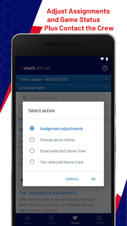 Game Status Updates: When a game is canceled or rescheduled, the assignor can use the app to update to the new date and time and communicate changes out to the officials crew assigned to that game.