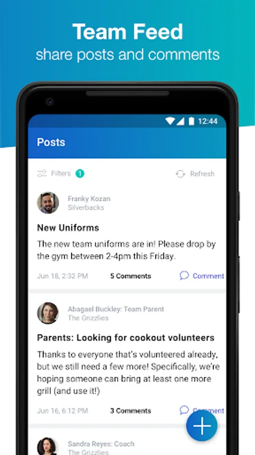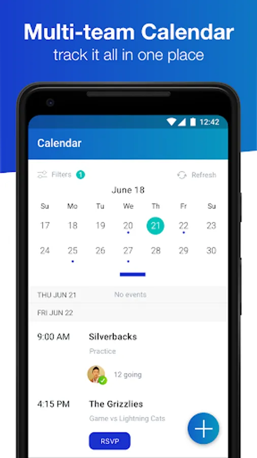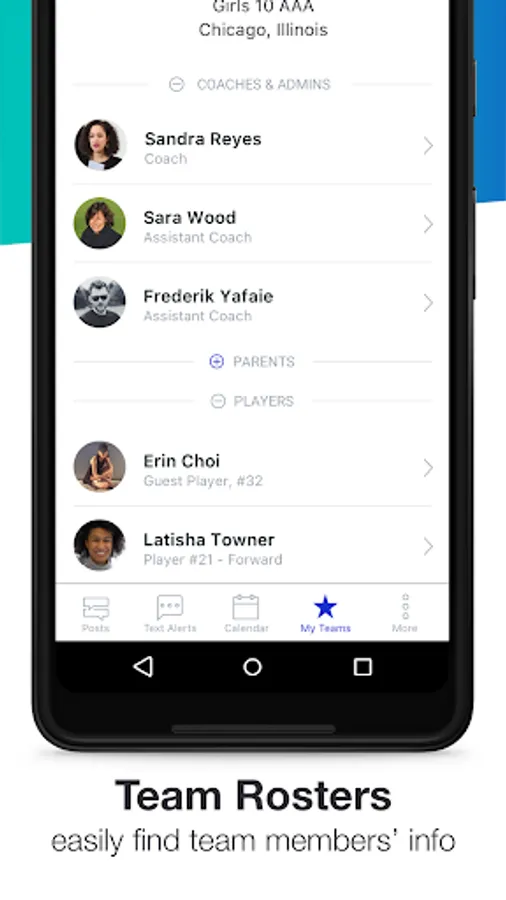 • ROSTERS — Keep track of your team's members and their contact information, and also attach parent profiles to players' so you can always get in touch.