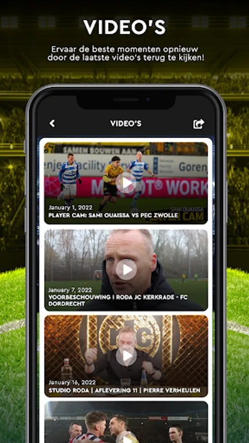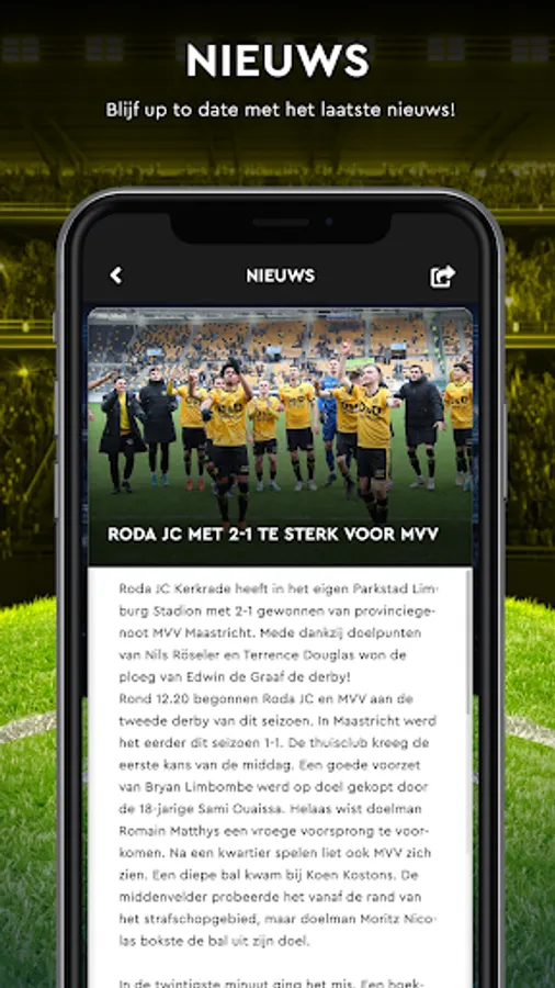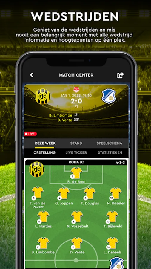 Are you at home or on your way? Track statistics, goals, players and match dates from minute to minute with the Roda JC Live tweeter feed in the app.